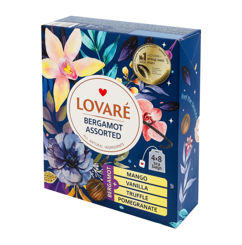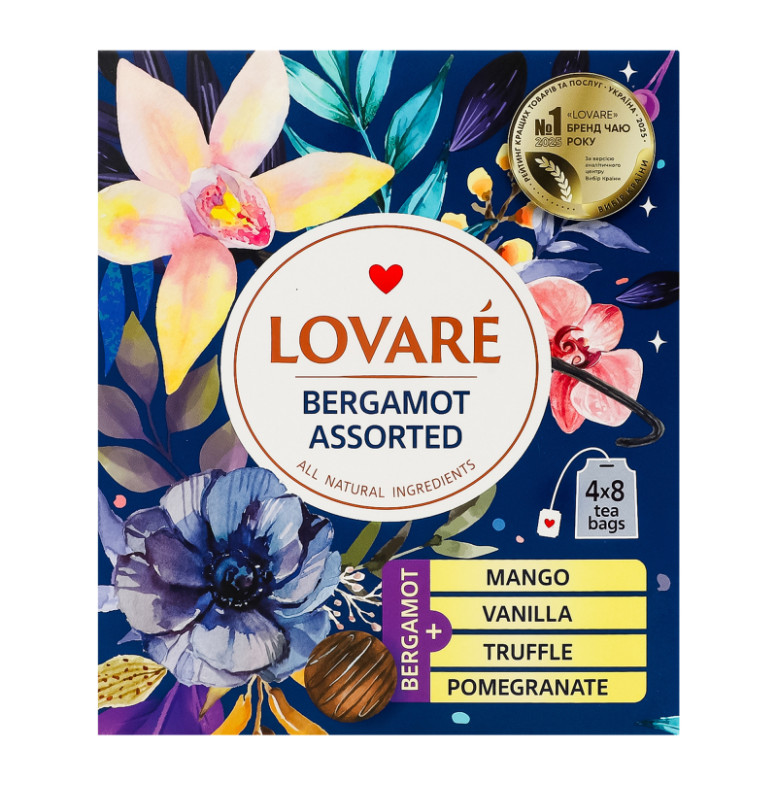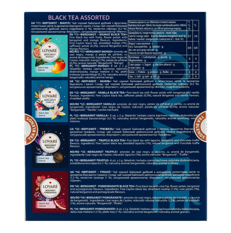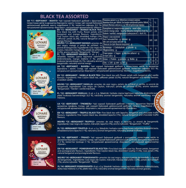Склад: Чай чорний байховий дрібний з фруктами, пелюстками квітів та ароматом бергамота і манго "Бергамот-манго": чай чорний байховий цейлонський дрібний, манго подрібнене (1%), пелюстки сафлору (0.2%), натуральний ароматизатор "Бергамот", натуральний ароматизатор "Манго". Чай чорний байховий дрібний з пелюстками квітів та ароматом бергамота і ванілі "Бергамот-ваніль": чай чорний байховий цейлонський дрібний, пелюстки сафлору (0.5%), натуральний ароматизатор "Бергамот", натуральний ароматизатор "Ваніль", подрібнена ваніль. Чай чорний байховий дрібний з лапачо, ароматом бергамота і ароматом трюфель "Бергамот-трюфель": чай чорний байховий цейлонський дрібний, лапачо подрібнене (1%), натуральний ароматизатор "Бергамот", натуральний ароматизатор "Трюфель". Чай чорний байховий дрібний з шипшиною, пелюстками квітів та ароматом бергамота і граната "Бергамот-гранат": чай чорний байховий цейлонський дрібний, шипшина подрібнена (1.5%), пелюстки троянди (1%), натуральний ароматизатор "Бергамот", натуральний ароматизатор "Гранат"