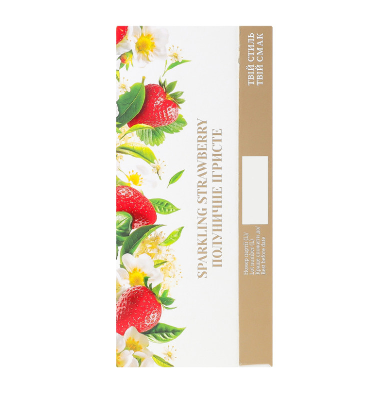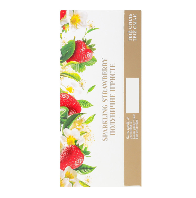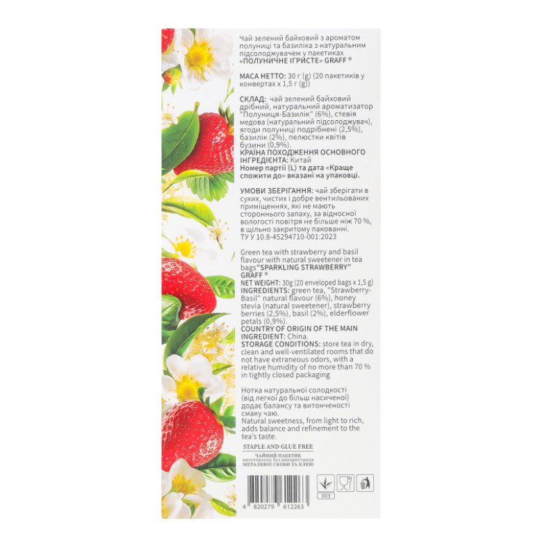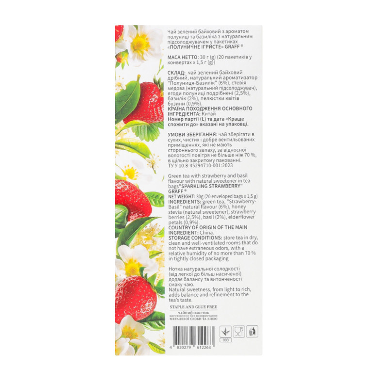 | Склад (укр.) | Чай зелений байховий дрібний, натуральний ароматизатор "Полуниця-базилік" (6%), стевія медова (натуральний підсолоджувач), ягоди полуниці подрібнені (2.5%), базилік (2%), пелюстки квітів бузини (0.9%) |