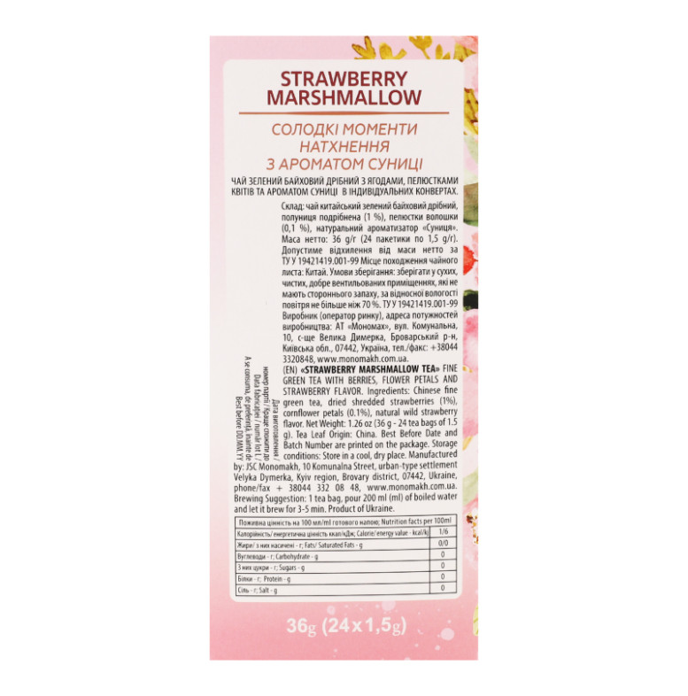 Склад: Чай китайський зелений байховий дрібний, суниця подрібнена (1%), пелюстки волошки (0.1%), натуральний ароматизатор "Суниця"