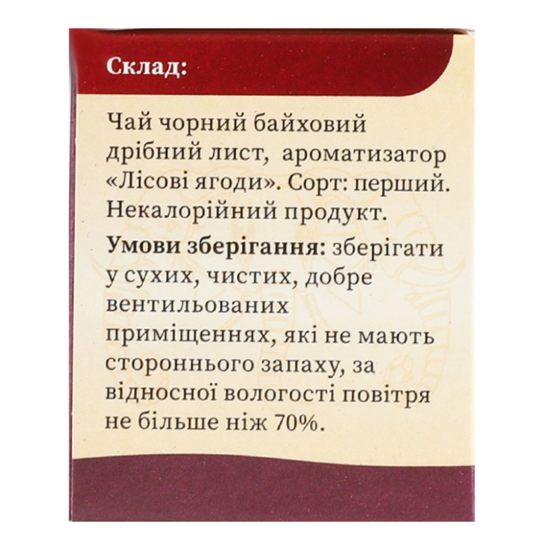 Склад: Чай чорний байховий дрібний лист, ароматизатор "Лісові ягоди"