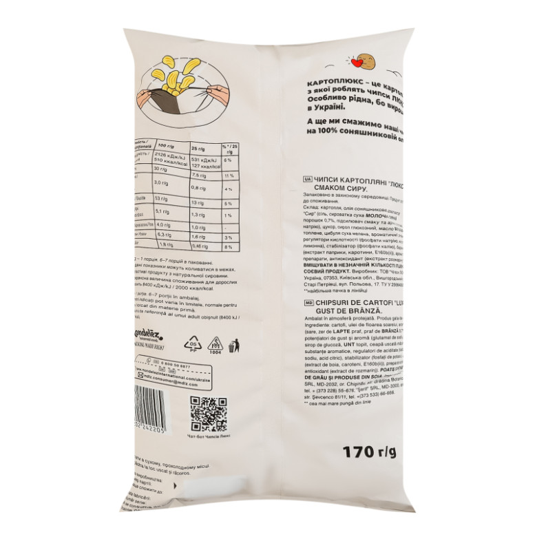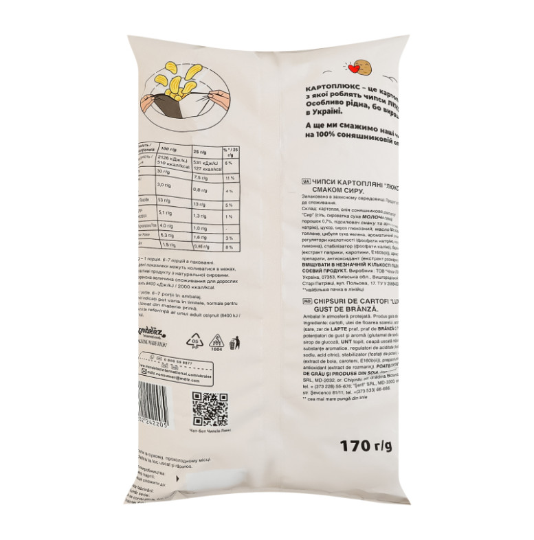 Склад: Картопля, олія соняшникова, ароматизатор "Сир" (сіль, сироватка суха молочна, сирний порошок 0.7%, підсилювач смаку та аромату (глутамат натрію), цукор, сироп глюкозний, масло вершкове топлене, цибуля суха мелена, ароматичні речовини, регулятори кислотності (фосфати натрію, кислота лимонна), стабілізатор (фосфати калію), барвники (екстракт паприки, каротини, Е160b(ii)), ароматичні препарати, антиоксидант (екстракт розмарину))