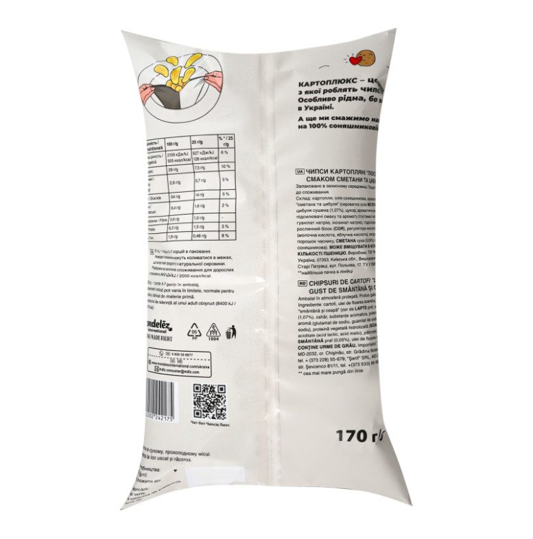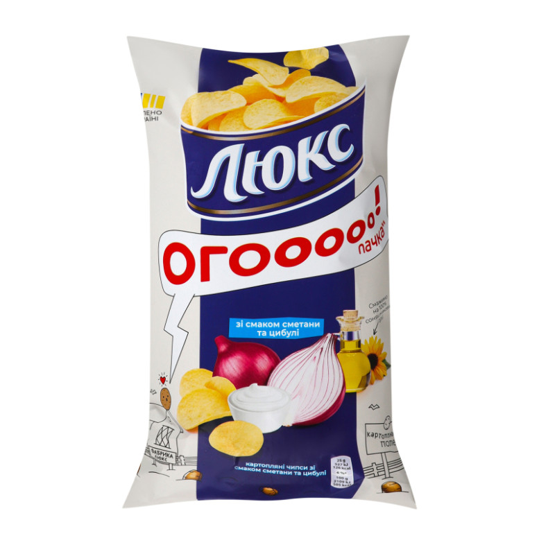 | Склад (укр.) | Картопля, олія соняшникова, ароматизатор "Сметана та цибуля" (сироватка суха молочна, сіль, цибуля сушена (1.07%), цукор, ароматичні речовини, підсилювачі смаку та аромату (глутамат натрію, гуанілат натрію, інозинат натрію), гідролізований рослинний білок (соя), регулятори кислотності (молочна кислота, яблучна кислота), петрушка, порошок часнику, сметана суха (0.05%), олія соняшникова) |