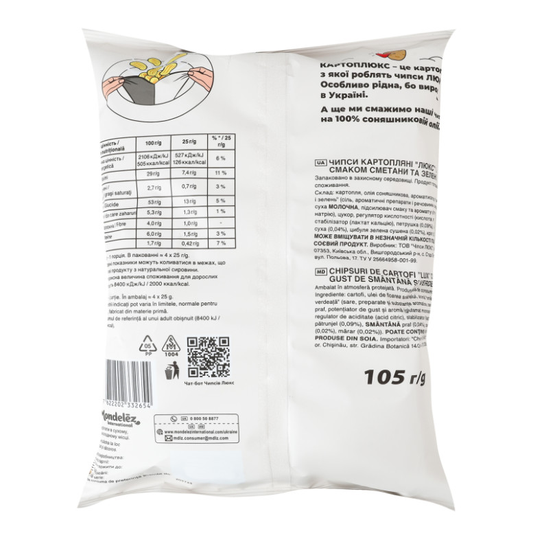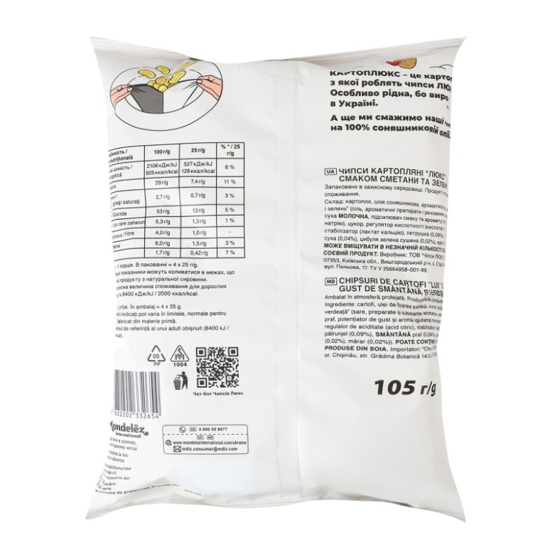 Склад (укр.) | Картопля, олія соняшникова, ароматизатор "сметана і зелень" (сіль, ароматичні препарати і речовини, сироватка суха молочна, підсилювач смаку та аромату (глутамат натрію), цукор, регулятор кислотності (кислота лимонна), стабілізатор (лактат кальцію), петрушка (0.09%), сметана суха (0.04%), цибуля зелена сушена (0.02%), кріп (0.02%)) |
