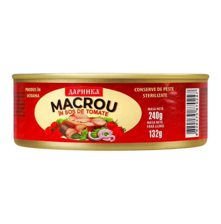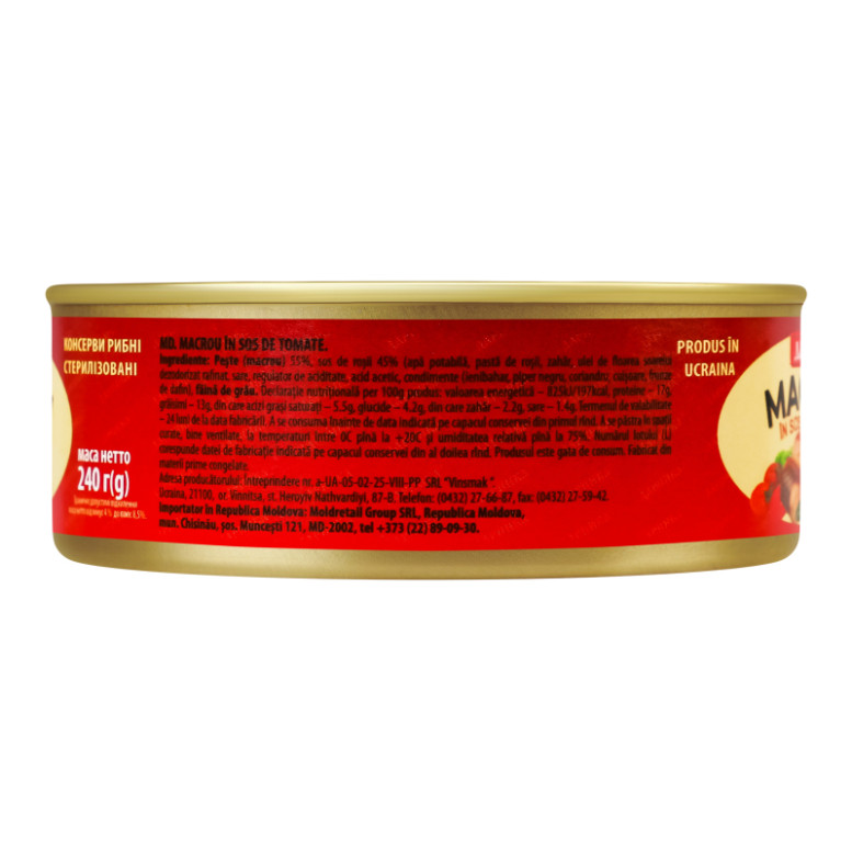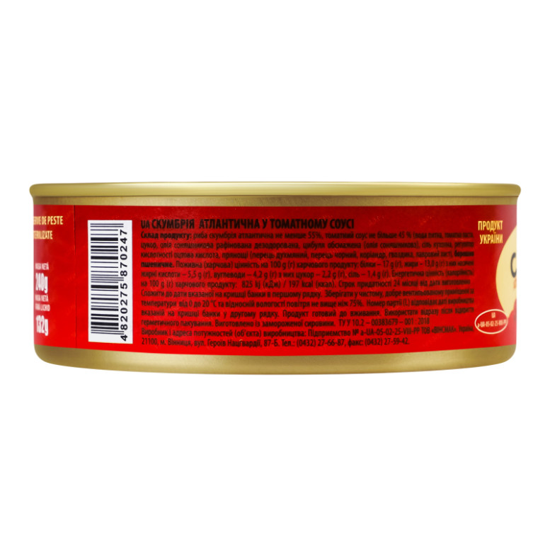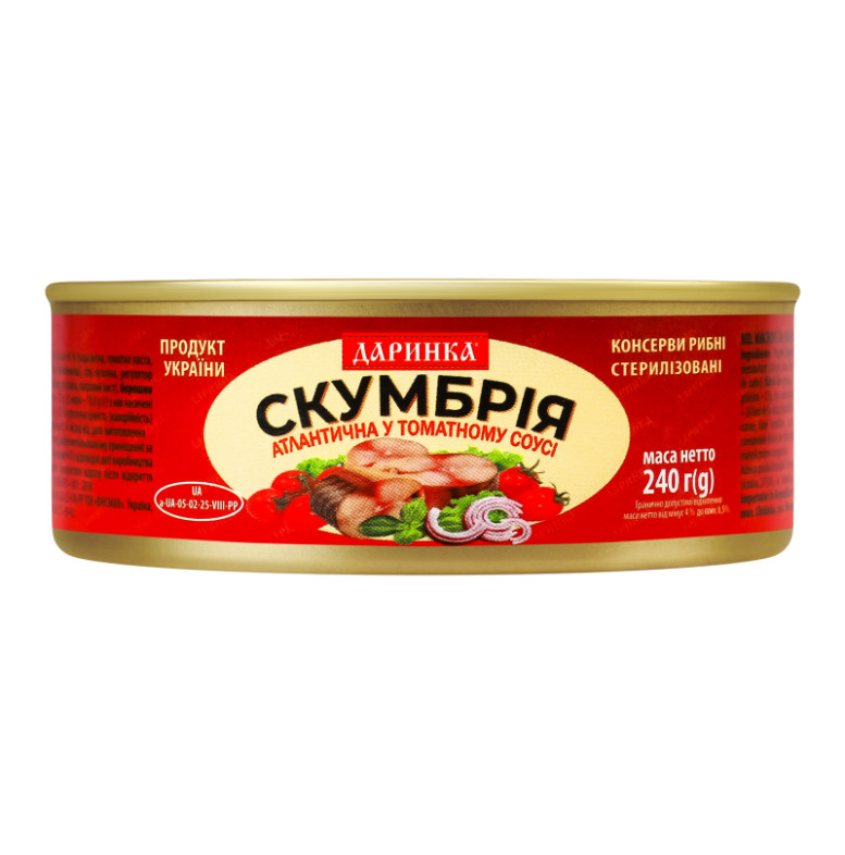 Склад: Риба скумбрія атлантична не менше 55%, томатний соус не більше 45% (вода питна, томатна паста, цукор, олія соняшникова рафінована дезодорована, цибуля обсмажена (олія соняшникова), сіль кухонна, регулятор кислотності оцтова кислота, прянощі (перець духмяний, перець чорний, коріандр, гвоздика, лавровий лист), борошно пшеничне