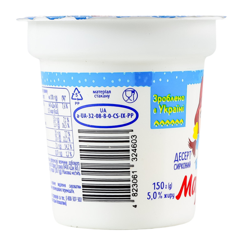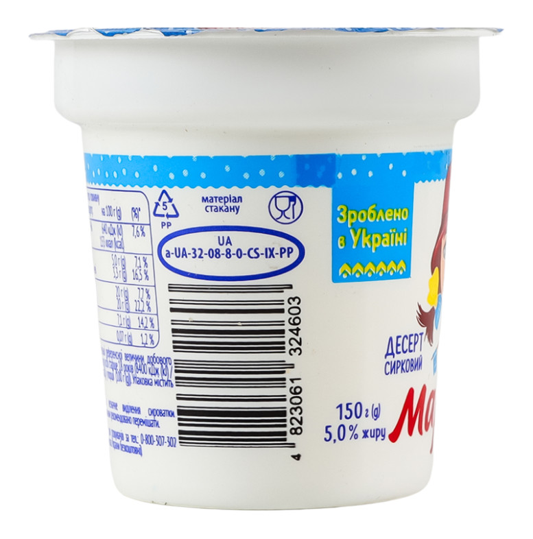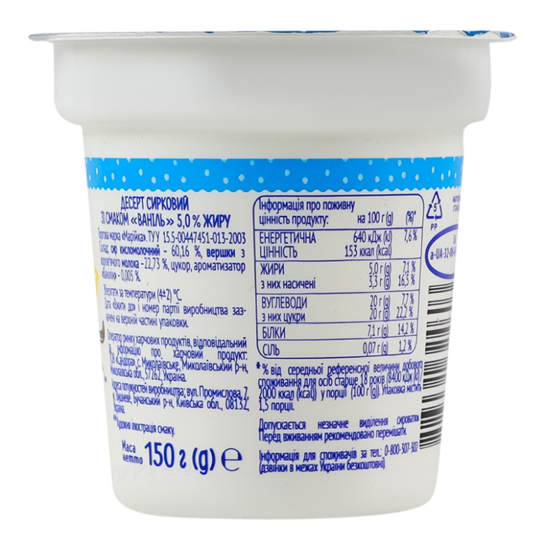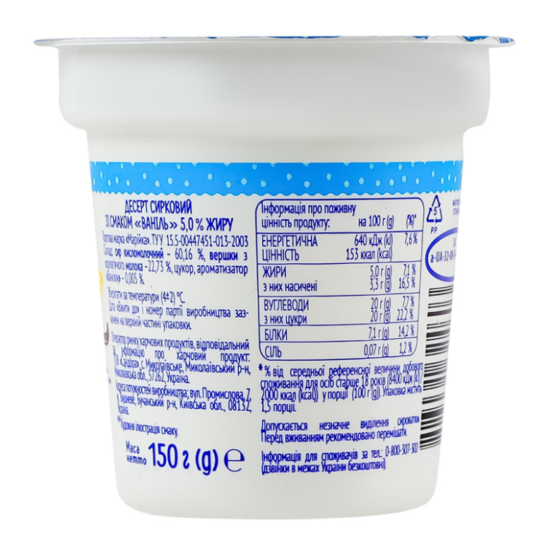 | Склад (укр.) | Сир кисломолочний - 60.16%, вершки з коров'ячого молока - 22.73%, цукор, ароматизатор "Ванілін" - 0.005% |