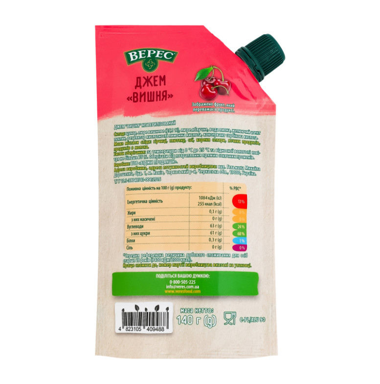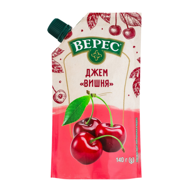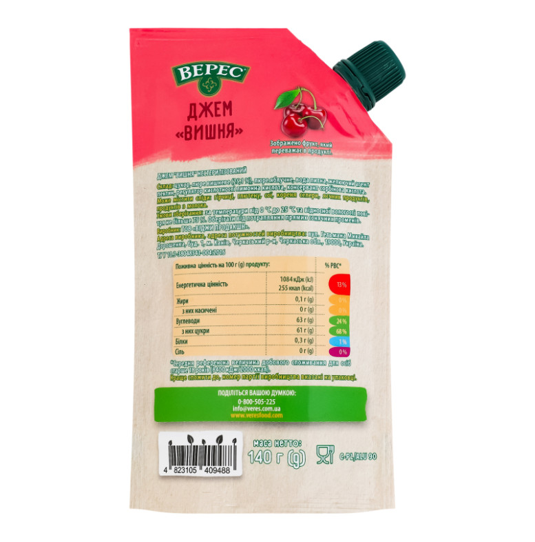 Склад: Цукор, пюре вишневе (25.1%), пюре яблучне, вода питна, желюючий агент пектин, регулятор кислотності лимонна кислота, консервант сорбінова кислота