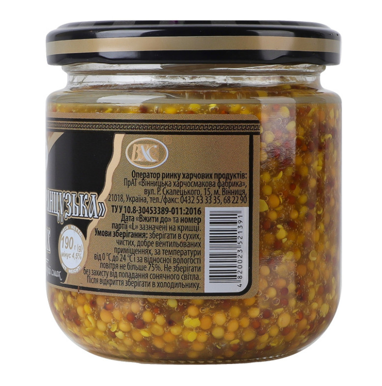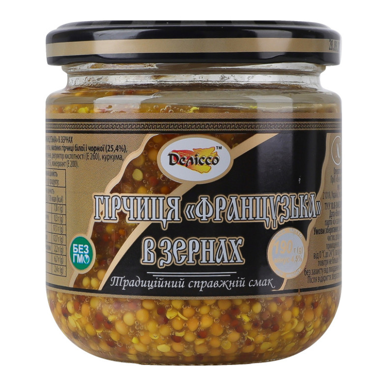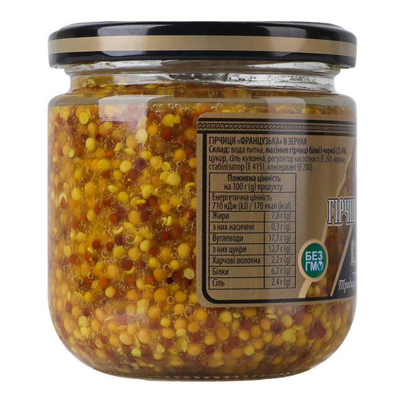 | Склад (укр.) | Вода питна, насіння гірчиці білої і чорної (25.4%), цукор, сіль кухонна, регулятор кислотності (E260), куркума, стабілізатор (E415), консервант (E200) |
