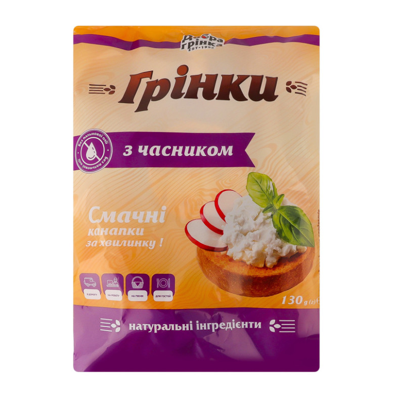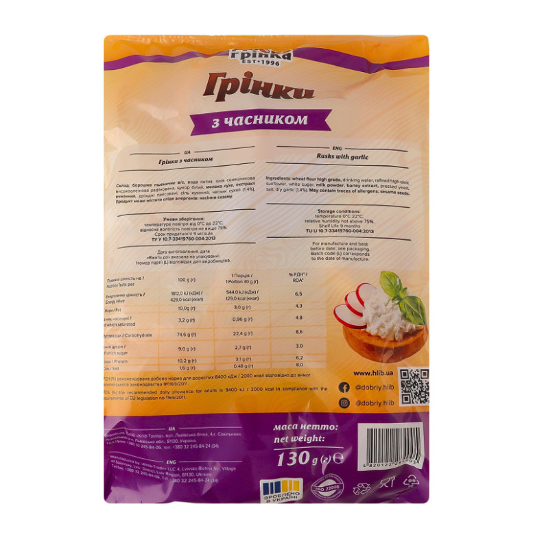 | Склад (укр.) | Борошно пшеничне в/с, вода питна, олія соняшникова високоолеїнова рафінована, цукор білий, молоко сухе, екстракт ячмінний, дріжджі пресовані, сіль кухонна, часник сухий (1.4%) |