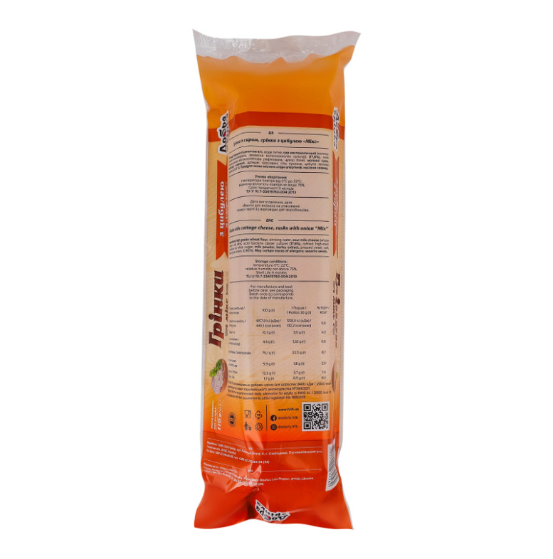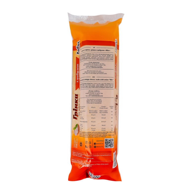 | Склад (укр.) | Борошно пшеничне в/с, вода питна, сир кисломолочний (молоко коров'яче незбиране, закваска молочнокислих культур) (17.6%), олія соняшникова високоолеїнова рафінована, цукор білий, молоко сухе, екстракт ячмінний, дріжджі пресовані, сіль кухонна, цибуля зелена сушена (0.85%) |