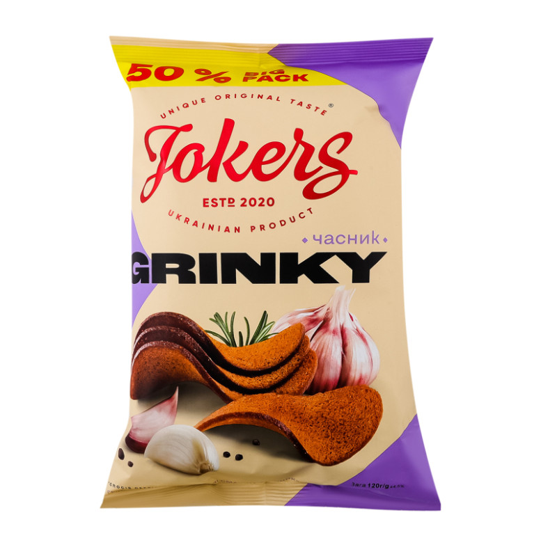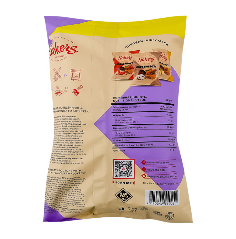 Склад: Хліб (борошно житнє 30%, борошно пшеничне 40%, сіль, вода, дріжджі пресовані), олія рослинна 1%, комплексна харчова добавка "Часник" 6% (сіль кухонна екстра, глюкоза харчова кристалічна гідратна, цукор білий, підсилювачі смаку та аромату: глутамат натрію, гуанілат натрію, інозінат натрію, ароматизатори, екстракт часнику, барвники: екстракт паприки, тартразин, понсо, діамантовий блакитний, антиспікаючий агент - діоксид кремнію)