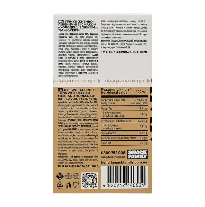 Склад: Хліб (борошно житнє 40%, борошно пшеничне 30%, сіль, вода, дріжджі), олії рослинні 1%, комплексна харчова добавка "Холодець з хріном" 6% (сіль кухонна, глюкоза харчова кристалічна гідратна, мальтодекстрин, цукор білий, підсилювачі смаку та аромату: глутамат натрію, інозінат натрію двозаміщений, динатрію-5-гуанілат, ароматизатори (соєві боби та вироби з них), гідролізований рослинний білок (соєві боби та вироби з них), часник мелений, гірчиця мелена, барвники: екстракт паприки, антиспікаючий агент - діоксид кремнію)