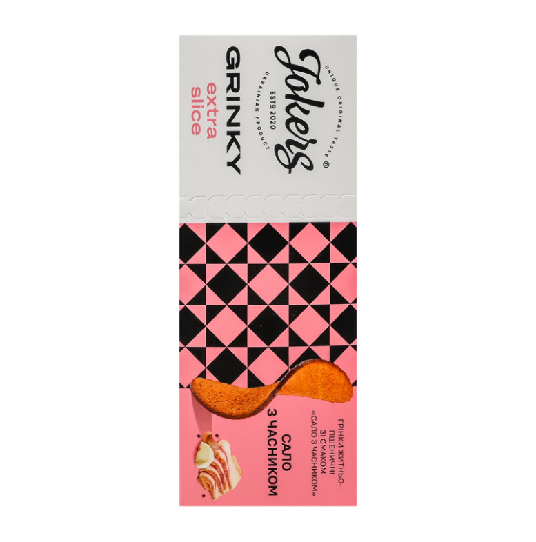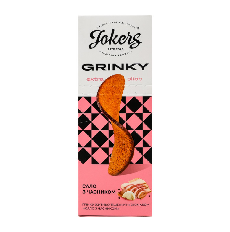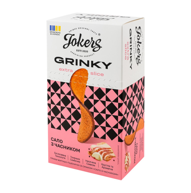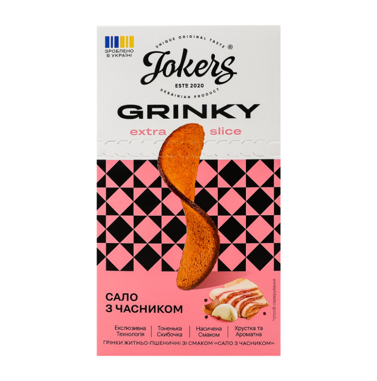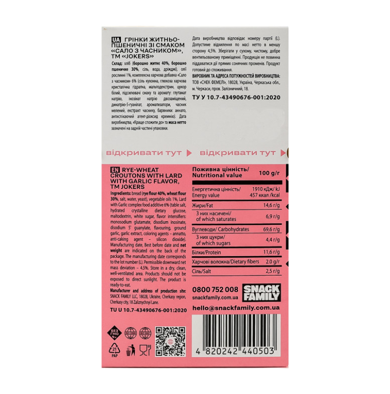 Склад: Хліб (борошно житнє 40%, борошно пшеничне 30%, сіль, вода, дріжджі), олії рослинні 1%, комплексна харчова добавка "Сало з часником" 6% (сіль кухонна, глюкоза харчова кристалічна гідратна, мальтодекстрин, цукор білий, підсилювачі смаку та аромату: глутамат натрію, інозінат натрію двозаміщений, динатрію-5-гуанілат, ароматизатори, часник мелений, екстракт часнику, барвники: аннато, антиспікаючий агент - діоксид кремнію)