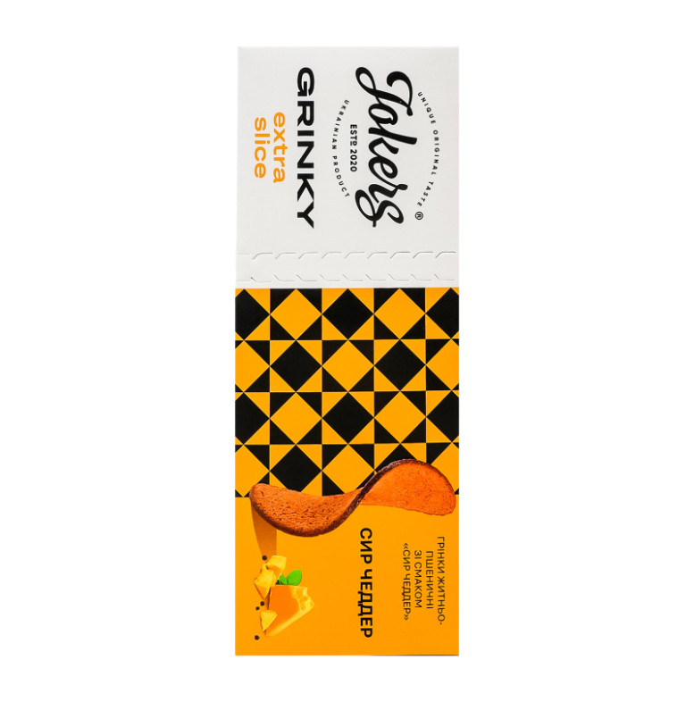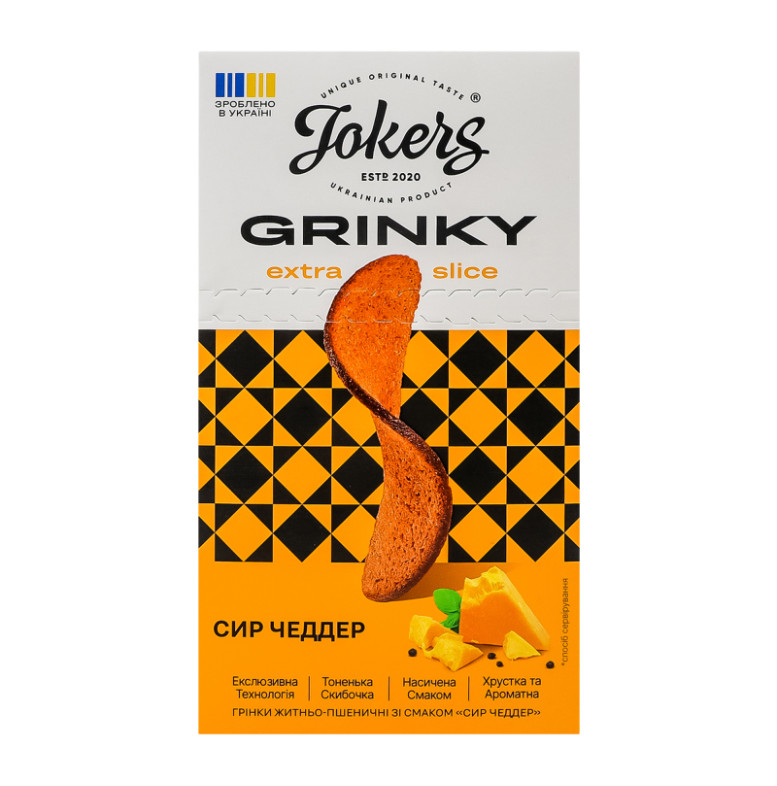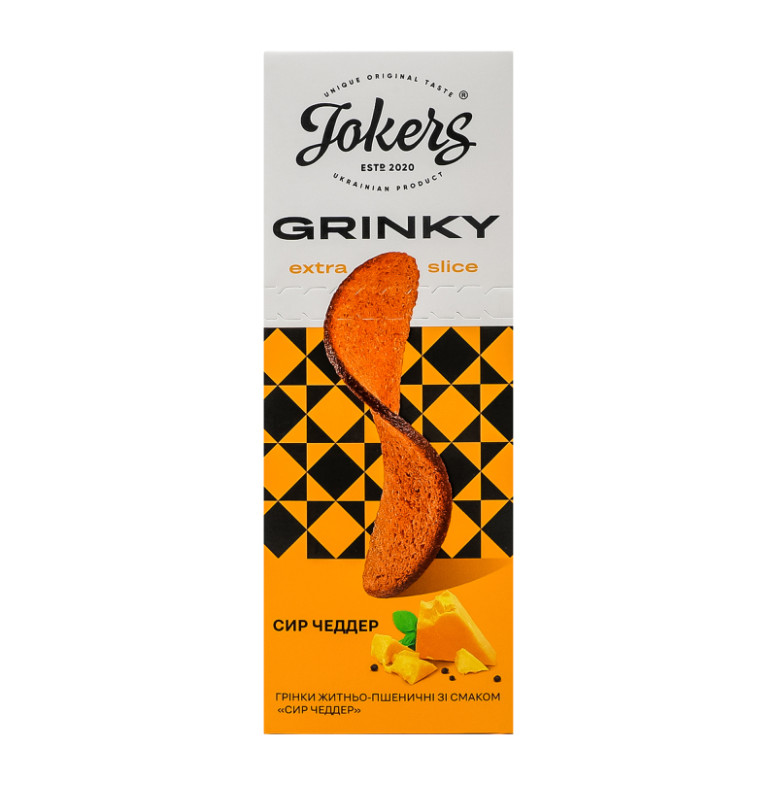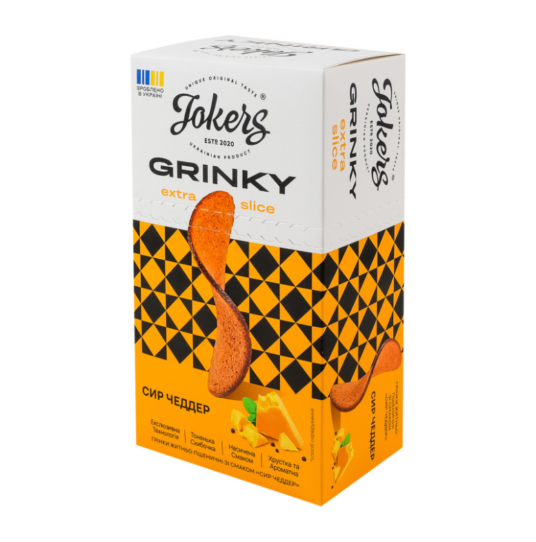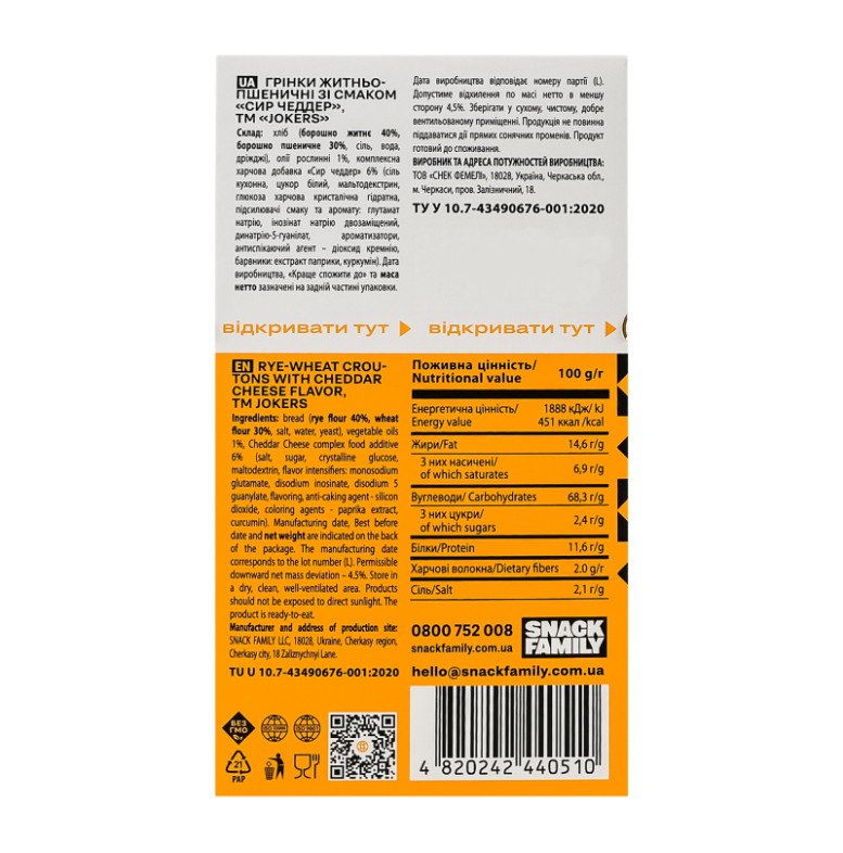 Склад: Хліб (борошно житнє 40%, борошно пшеничне 30%, сіль, вода, дріжджі), олії рослинні 1%, комплексна харчова добавка "Сир чеддер" 6% (сіль кухонна, цукор білий, мальтодекстрин, глюкоза харчова кристалічна гідратна, підсилювачі смаку та аромату: глутамат натрію, інозінат натрію двозаміщений, динатрію-5-гуанілат, ароматизатори, антиспікаючий агент діоксид кремнію, барвники: екстракт паприки, куркумін)