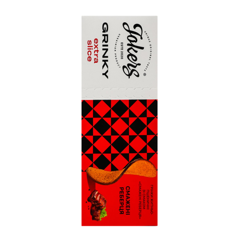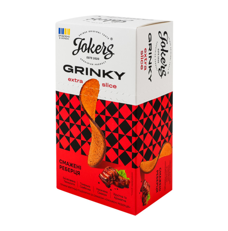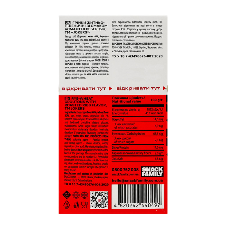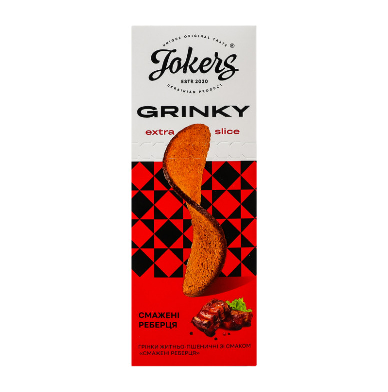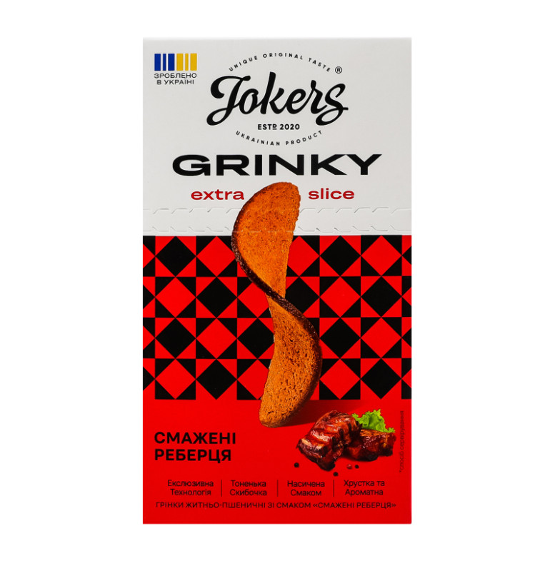 Склад: Хліб (борошно житнє 40%, борошно пшеничне 30%, сіль, вода), олії рослинні 1%, комплексна харчова добавка "Смажені реберця" 6% (сіль кухонна, глюкоза харчова кристалічна гідратна, мальтодекстрин, цукор білий, підсилювачі смаку та аромату: глутамат натрію, інозінат натрію двозаміщений, динатрію-5-гуанілат, ароматизатори (містять алерген соєві боби і вироби з них), барвник - екстракт паприки, антиспікаючий агент - діоксид кремнію, регулятор кислотності - лимонна кислота)