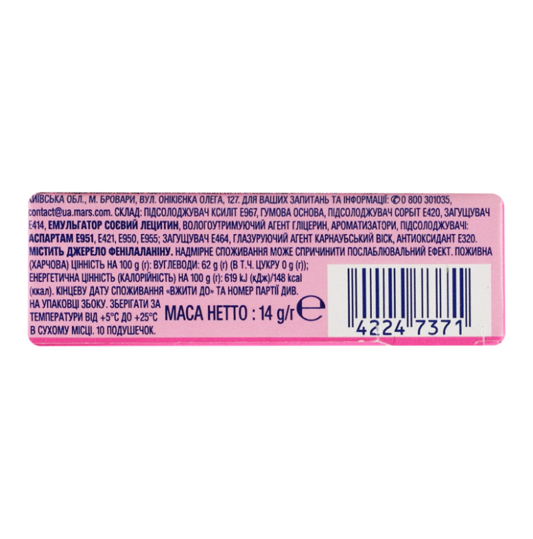 Склад: Підсолоджувач ксиліт Е967, підсолоджувач сорбіт Е420, гумова основа, барвник Е170, загущувач Е414, ємульгатор соєвий лецитин, вологоутримуючий агент гліцерин, ароматизатори, підсолоджувачі: аспартам Е951, Е421, Е950, Е955, антиспікаючий агент Е553, глазуруючий агент Е903, загущувач Е464, регулятори кислотності: Е524, Е260, антиоксидант Е320