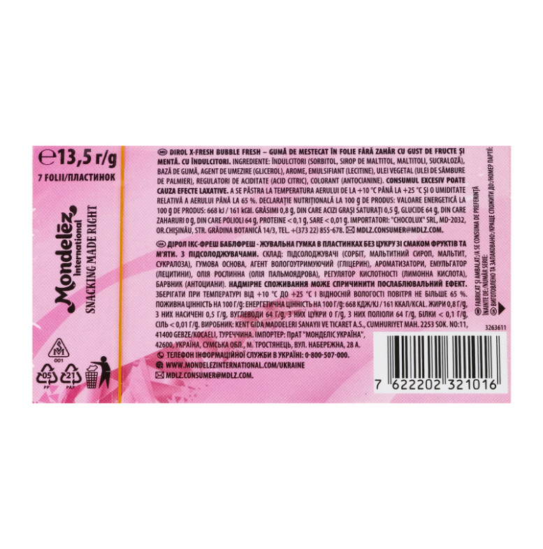 Склад (укр.) | Підсолоджувачі (сорбіт, мальтитний сироп, мальтит, сукралоза), гумова основа, агент вологоутримуючий (гліцерин), ароматизатори, емульгатор (лецитини), олія рослинна (олія пальмоядрова), регулятор кислотності (лимонна кислота), барвник (антоциани) |