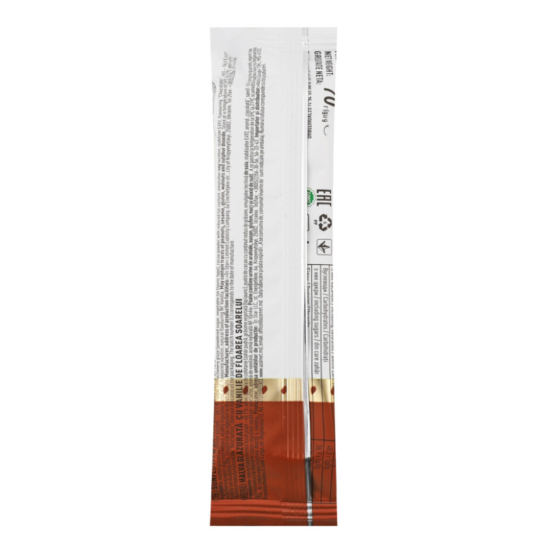 Склад: Ядро соняшникове обсмажене розтерте - 49%, цукор білий, кондитерська глазур (цукор, замінник масла какао (жир рослинний пальмовий повністю гідрогенізований), какао-порошок - 8.1% (вміст какао-масла - 1.1%), емульгатор лецитин соєвий (Е322), сіль, ароматизатори: "Ваніль", "Чорний шоколад") - 16.4%, патока крохмальна кукурудзяна, піноутворювач екстракт кореня колючелистника, кислота лимонна (Е330), ароматизатор ванілін, екстракт ванілі