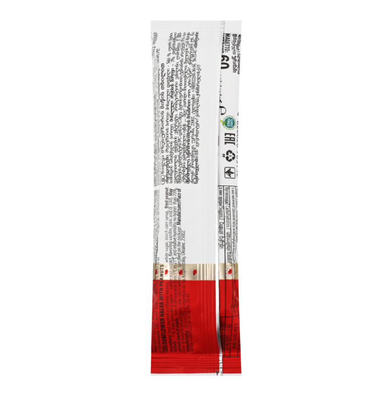 Склад: Ядро соняшникове обсмажене розтерте - 54.6%, цукор білий, патока крохмальна кукурудзяна, ядро арахісу обсмажене - 7%, піноутворювач екстракт кореня колючелистника, ароматизатор ванілін, кислота лимонна (Е330)