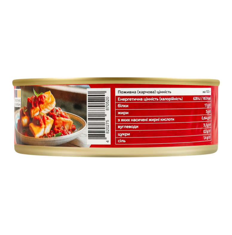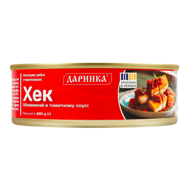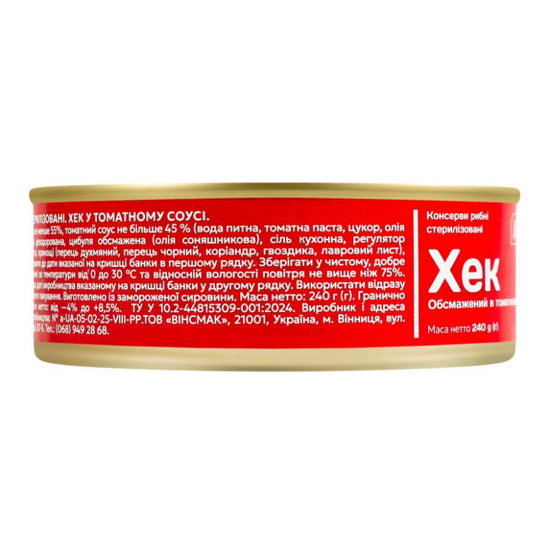 Склад: Риба хек не менше 55%, томатний соус не більше 45% (вода питна, томатна паста, цукор, олія соняшникова рафінована дезодорована, цибуля обсмажена (олія соняшникова), сіль кухонна, регулятор кислотності оцтова кислота, прянощі (перець духмяний, перець чорний, коріандр, гвоздика, лавровий лист), борошно пшеничне