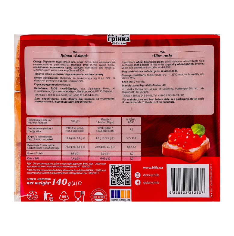| Склад (укр.) | Борошно пшеничне в/с, вода питна, олія соняшникова високоолеїнова рафінована, молоко сухе (4.7%), цукор білий, клейковина пшенична суха, дріжджі пресовані, сіль кухонна, антиоксидант: кислота аскорбінова (Е300) |