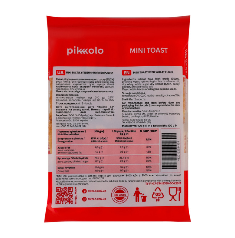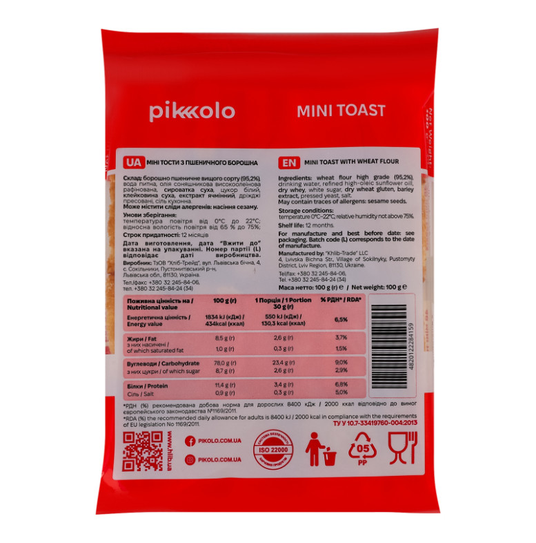 | Склад (укр.) | Борошно пшеничне вищого сорту (95.2%), вода питна, олія соняшникова високоолеїнова рафінована, сироватка суха, цукор білий, клейковина суха, екстракт ячмінний, дріжджі пресовані, сіль кухонна |