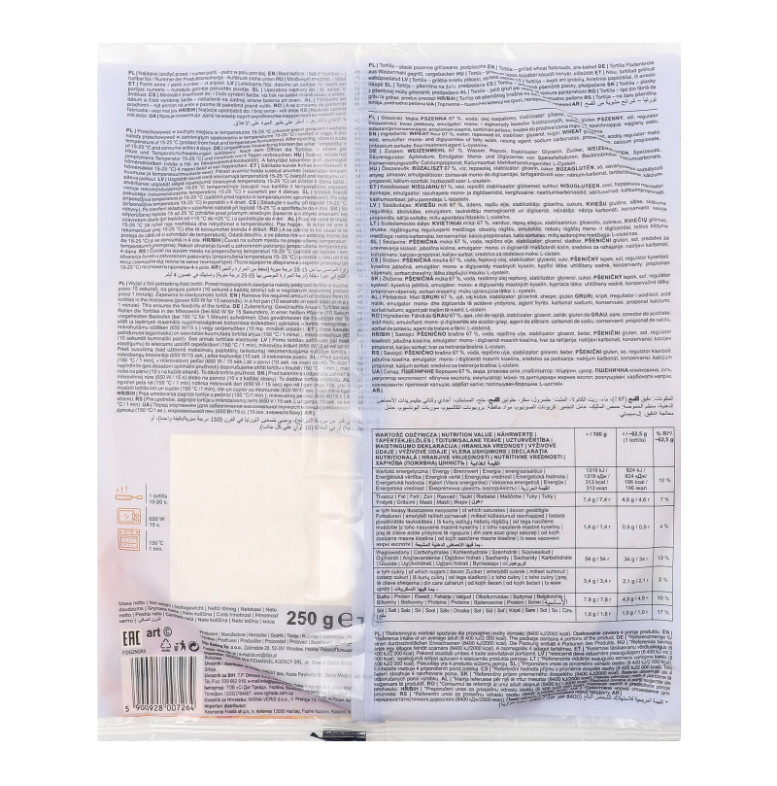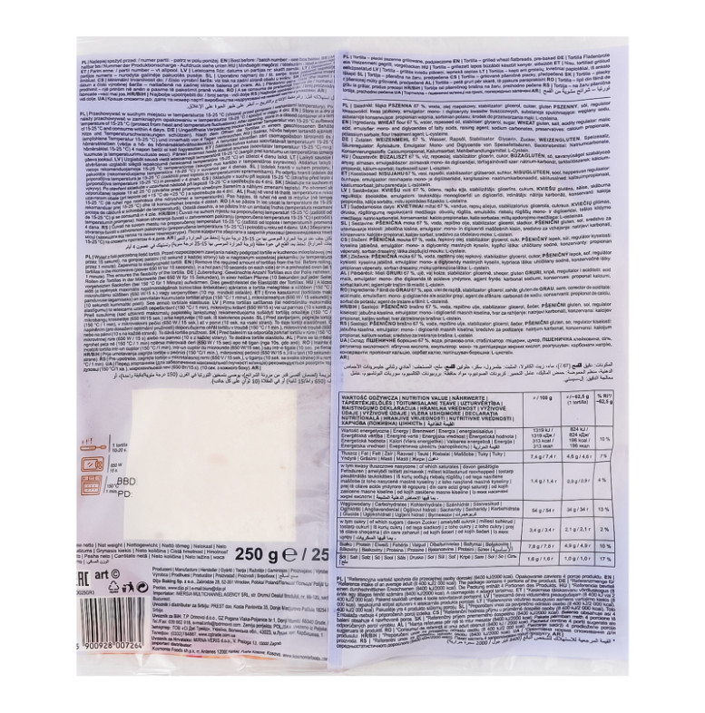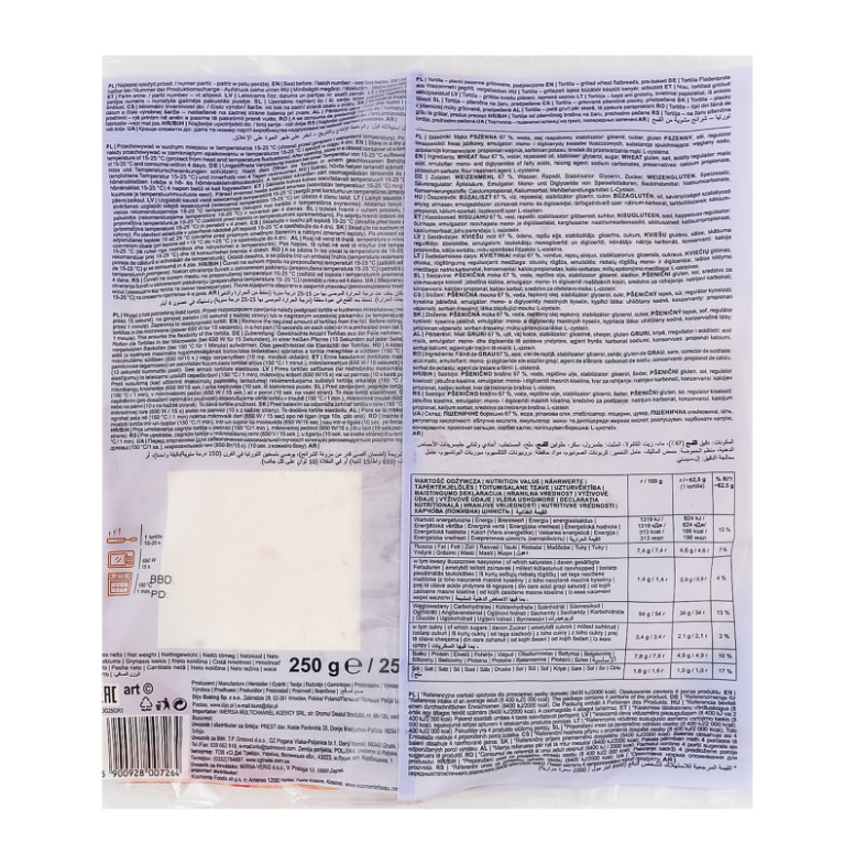 | Склад (укр.) | Пшеничне борошно 67%, вода, ріпакова олія, стабілізатор: гліцерин, цукор, пшенична клейковина, сіль, регулятор кислотності: яблучна кислота, емульгатор: моно- та дигліцериди жирних кислот, розпушувач: карбонати натрію, консерванти: пропіонат кальцію, сорбат калію, поліпшувач борошна: L-цистеїн |