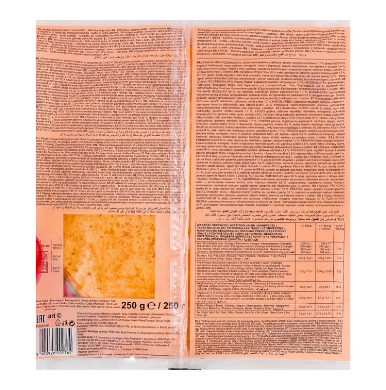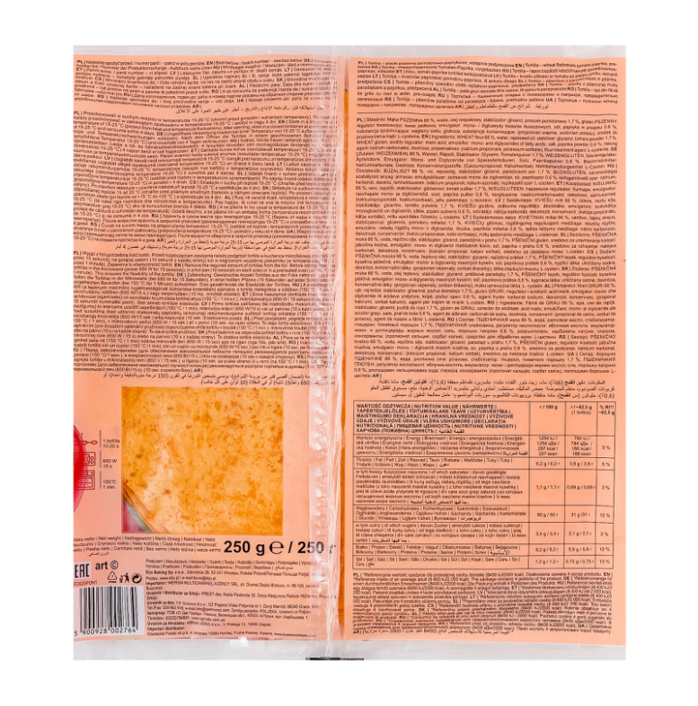 | Склад (укр.) | Борошно пшеничне 66%, вода, рослинна олія: ріпакова, стабілізатор: гліцерол, томатного порошку 1.7%, пшеничний глютен, регулятор кислотності: яблучна кислота, емульгатор: моно- і дигліцериди жирних кислот, сіль, порошку паприки 0.5%, розпушувач: кальцинована сода, глюкоза, консерванти: (пропіонат кальцію, сорбат калію), поліпшувач борошна: L- цистеїн |