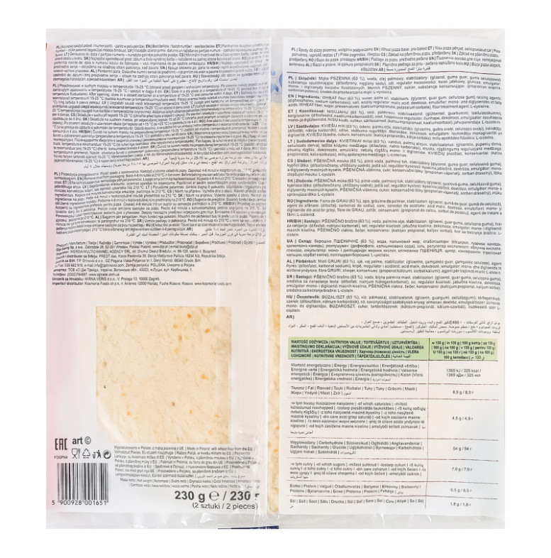 | Склад (укр.) | Борошно пшеничне (63%), вода, пальмовий жир, стабілізатори: (гліцерол, гуарова камедь, целюлозна камедь), розпушувач: (дифосфати, кальцинована сода), сіль, регулятор кислотності: яблучна кислота, глюкоза, емульгатор: моно- і дигліцериди жирних кислот, клітковина пшениця, цукор, консерванти (пропіонат кальцію, сорбат калію), поліпшувач борошна: L-цистеїн |