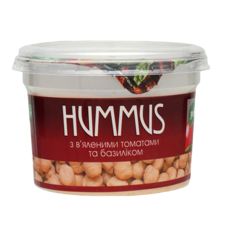 | Склад (укр.) | Боби нуту варені 66.4%, наповнювач "Томати в'ялені" 11.6% (томати свіжоморожені 81%, томатна паста (томати свіжі уварені, сіль кухонна (2.5%), регулятор кислотності: лимонна кислота, консерванти: бензоат натрію, сорбат калію), олія соняшникова рафінована, томати сушені 5%, прянощі сушені: часник, базилік 0.3%, чебрець), насіння кунжуту, олія соняшникова рафінована, вода питна, сіль кухонна, регулятор кислотності лимонна кислота, консерванти: сорбат калію, бензоат натрію: загущувач камедь гуарова |