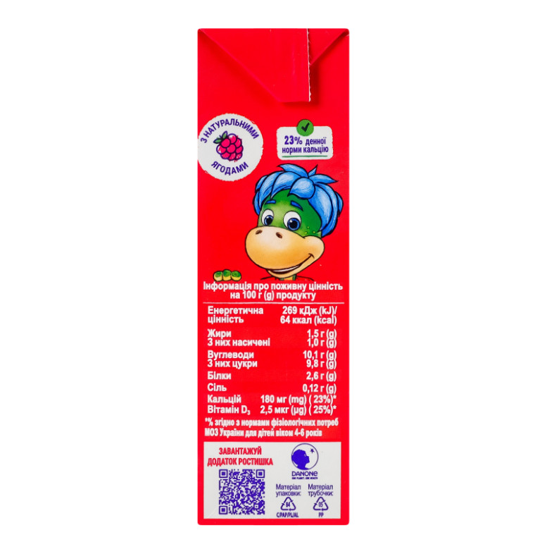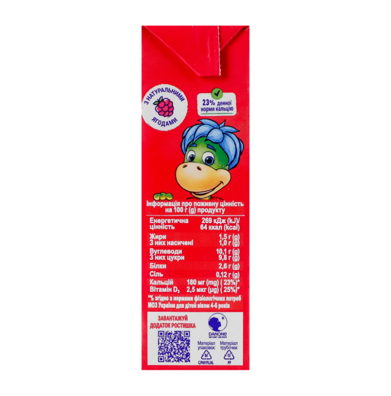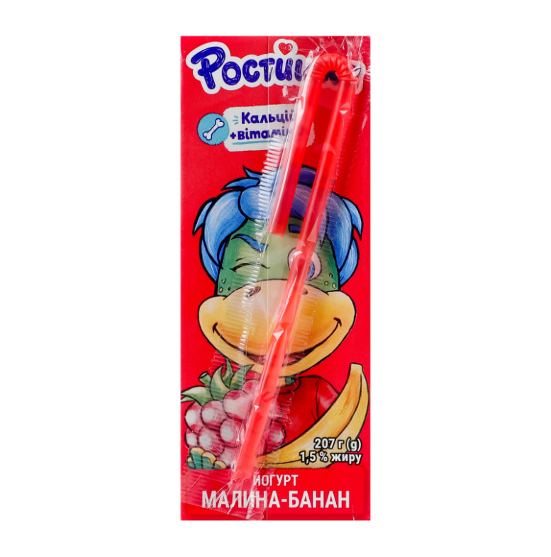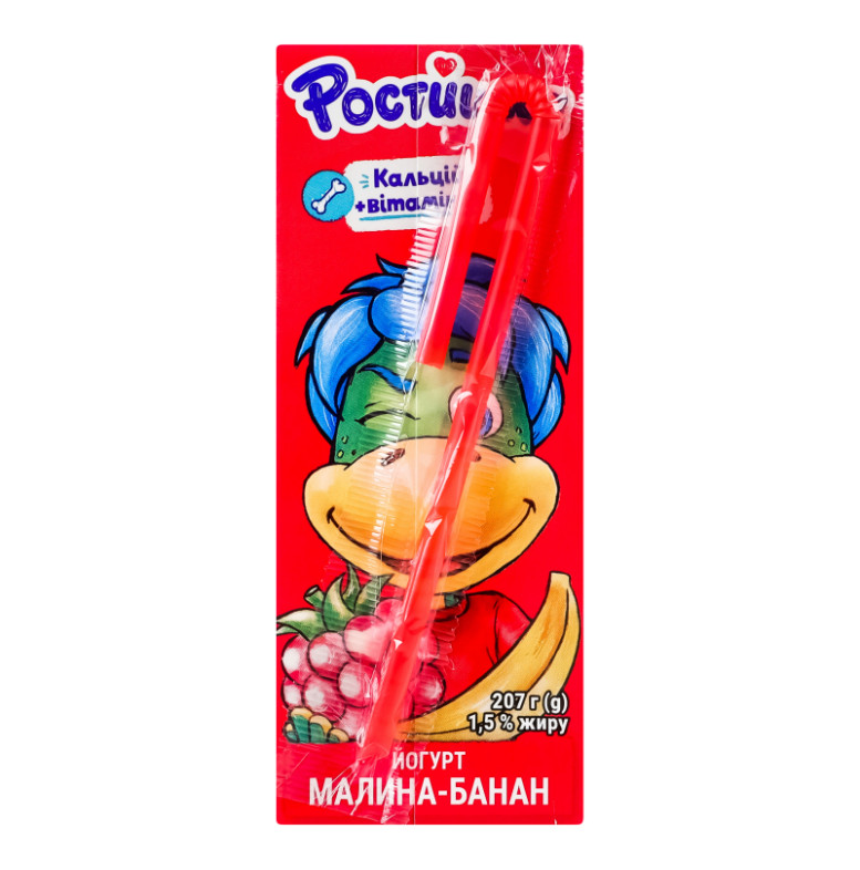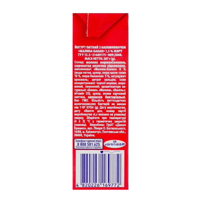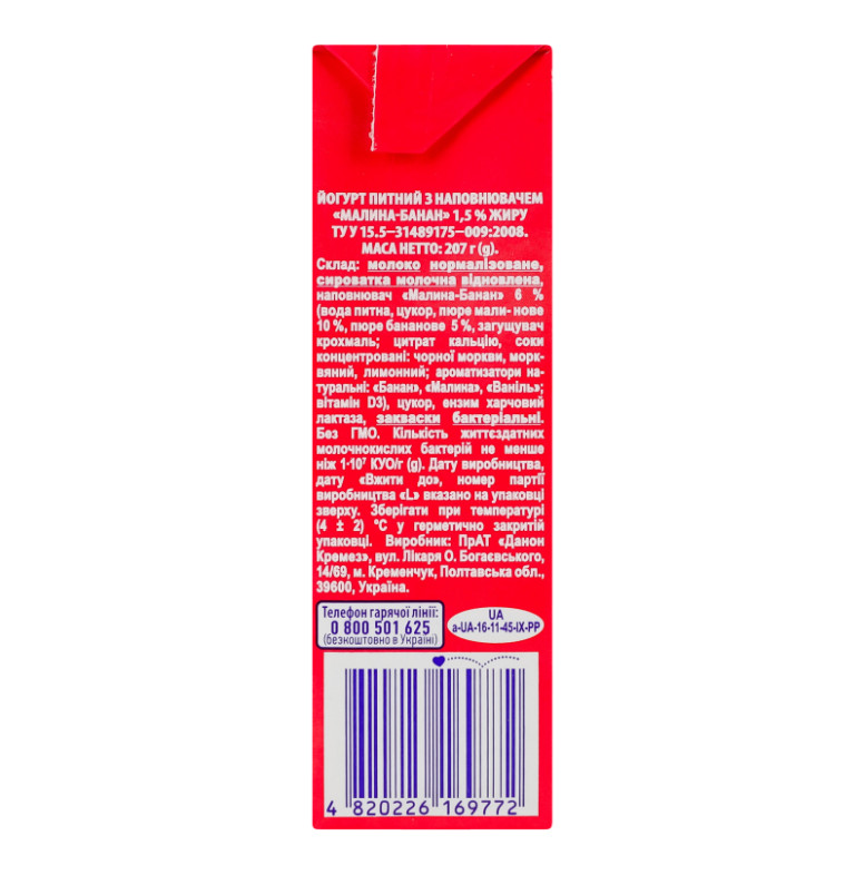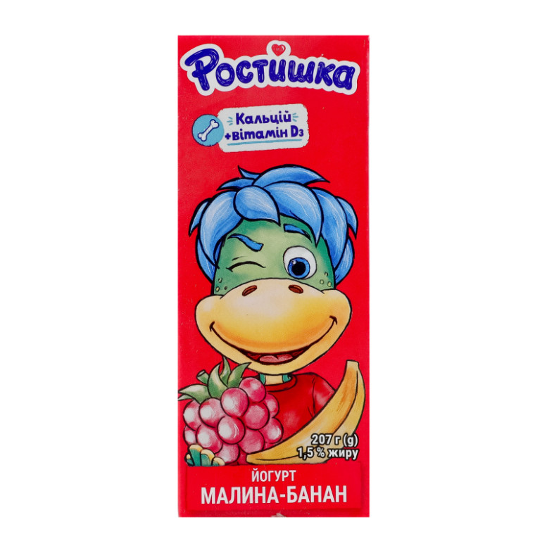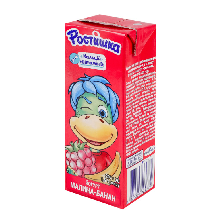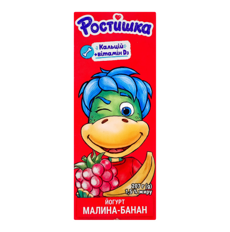 | Склад (укр.) | Молоко нормалізоване, сироватка молочна відновлена, наповнювач "Малина-Банан" 6% (вода питна, цукор, пюре малинове 10%, пюре бананове 5%, загущувач крохмаль; цитрат кальцію, соки концентровані: чорної моркви, морквяний, лимонний; ароматизатори натуральні: "Банан", "Малина", "Ваніль", вітамін D3), цукор, ензим харчовий лактаза, закваски бактеріальні |