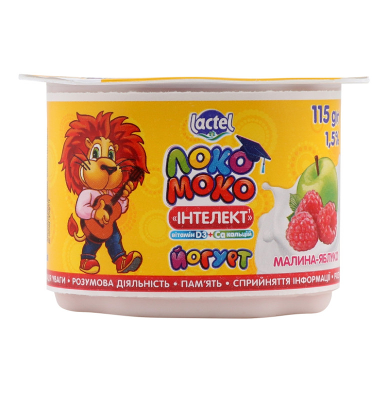 Склад: Молоко нормалізоване, цукор, фруктовий наповнювач пастеризований "Малина-Яблуко" (7%) (вода, цукор, малинове пюре (6%), яблучне пюре (6%), модифікований крохмаль кукурудзяний, комплексоутворювач цитрат кальцію, натуральний ароматизатор, тип "малина", вітамінно-мінеральний комплекс "Інтелект" (0.4%) (цинку глюконат, пантотенова кислота), сік чорної моркви концентрований, риб'ячий жир (0.05% омега-3), регулятори кислотності: лимонна кислота, цитрат натрію, вітамін D3), модифікований крохмаль кукурудзяний, молоко сухе знежирене, загущувач желатин, закваска бактеріальна