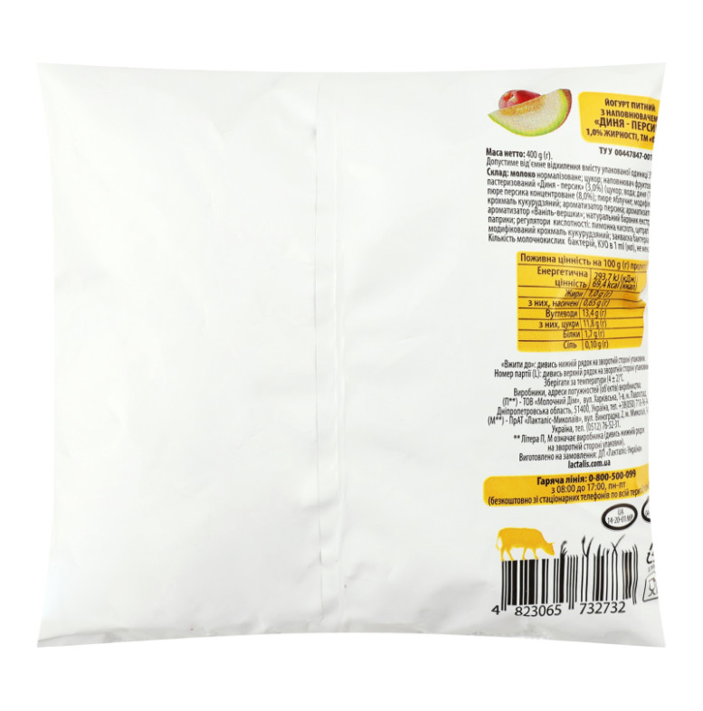 Склад: Молоко нормалізоване, цукор, наповнювач фруктовий пастеризований "Диня-персик" (3%) (цукор, вода, диня (10%), пюре персика концентроване (8%), пюре яблучне, модифікований крохмаль кукурудзяний, ароматизатор персика, ароматизатор дині, ароматизатор "Ваніль-вершки", натуральний барвник екстракт паприки, регулятори кислотності: лимонна кислота, цитрат натрію), модифікований крохмаль кукурудзяний, закваска бактеріальна