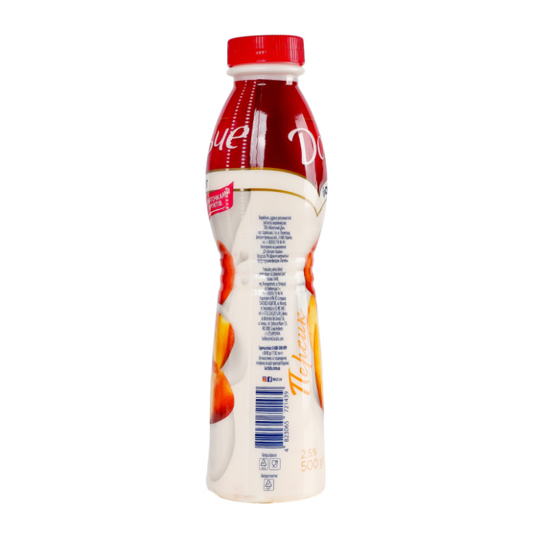 Склад: Молоко нормалізоване, фруктовий наповнювач пастеризований "Персик" 7% (50% персик, цукор, вода, цукровий сироп, модифікований крохмаль кукурудзяний, ароматизатор персика, натуральні барвники: β-каротин/екстракт паприки, регулятори кислотності: лимонна кислота, цитрат натрію, стабілізатори каррагінани), цукор, закваска бактеріальна