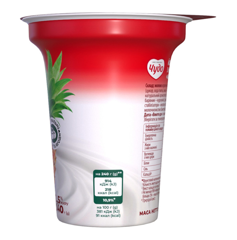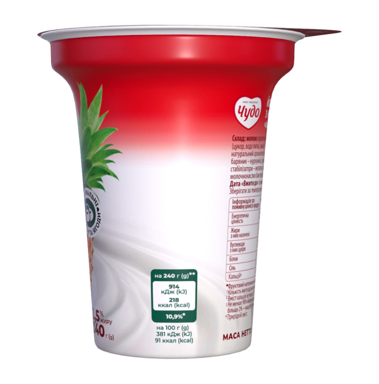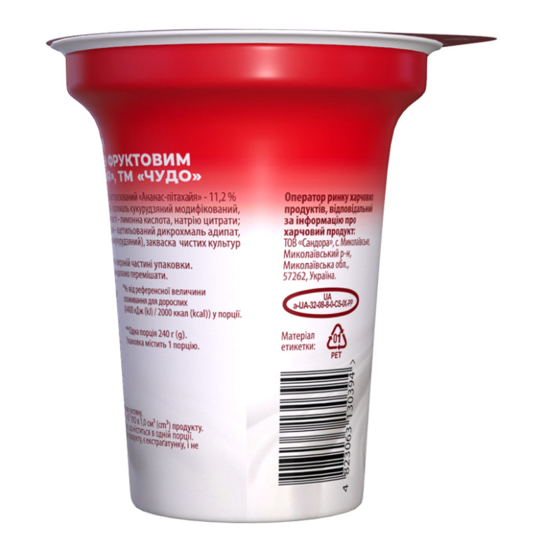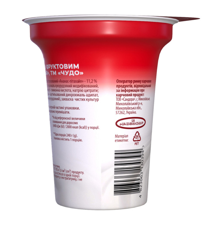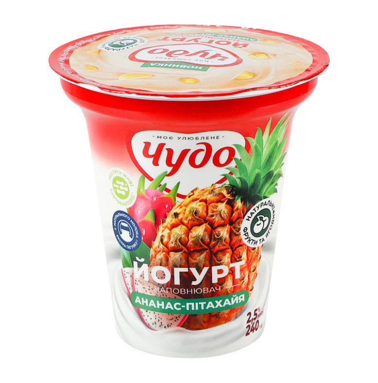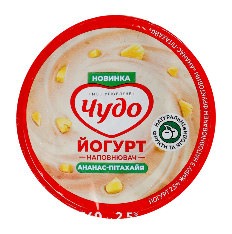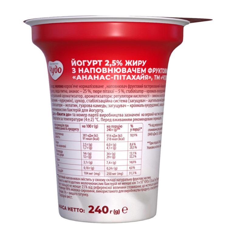 Склад: Молоко коров'яче нормалізоване, наповнювач фруктовий пастеризований "Ананас-пітахая" - 11.2% (цукор, вода питна, ананас - 25%, пюре пітахаї - 5%, стабілізатор - крохмаль кукурудзяний модифікований, натуральний ароматизатор, ароматизатори, регулятори кислотності - лимонна кислота, натрію цитрати, барвник - куркумін), цукор, стабілізаційна система (загущувач - ацетильований дикрохмаль адипат, стабілізатори - желатин, гуарова камедь, загущувач - крохмаль кукурудзяний), закваска чистих культур молочнокислих бактерій для йогурту