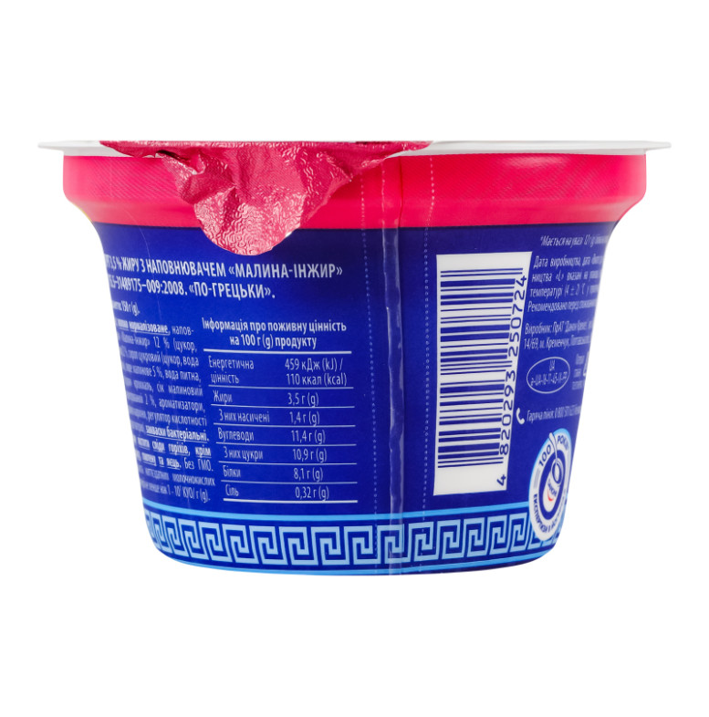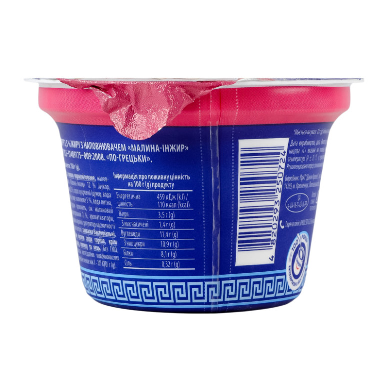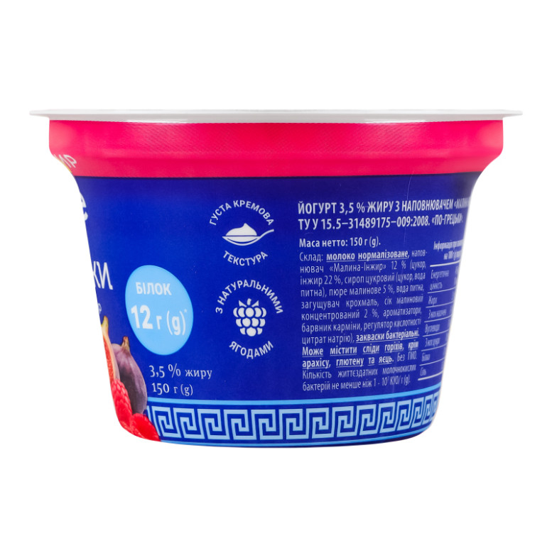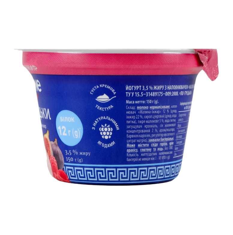| Склад (укр.) | Молоко нормалізоване, наповнювач "Малина-інжир" 12% (цукор, інжир 22%, сироп цукровий (цукор, вода питна), пюре малинове 5%, вода питна, загущувач крохмаль, сік малиновий концентрований 2%, ароматизатори, барвник карміни, регулятор кислотності цитрат натрію), закваски бактеріальні |