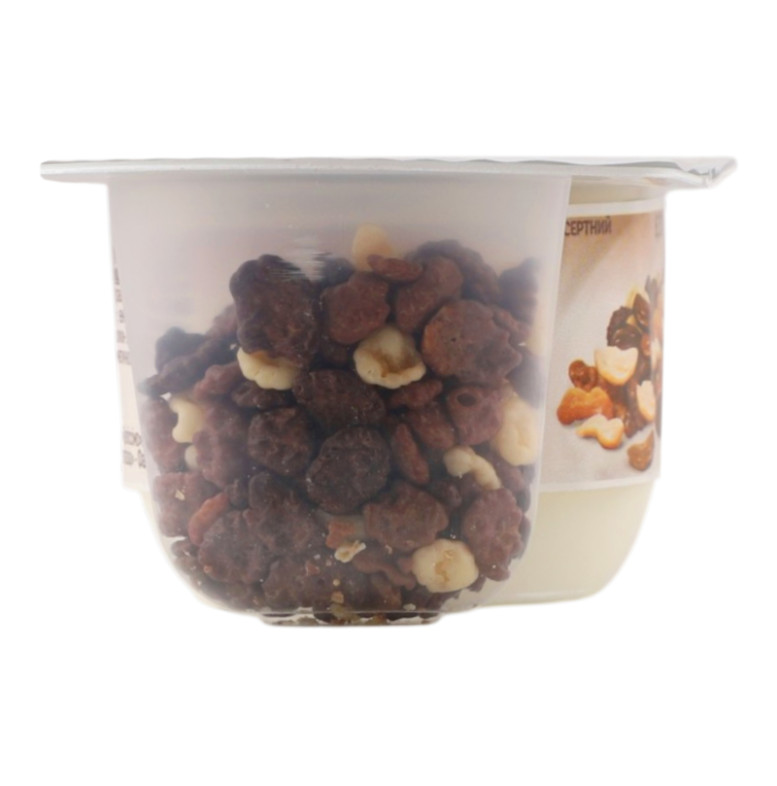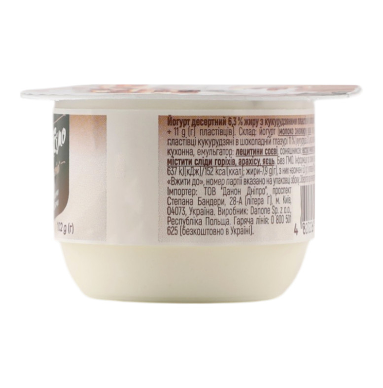 Склад: Йогурт (молоко знежирене, вершки, цукор, молоко сухе знежирене, культури йогуртові), пластівці кукурудзяні в шоколадній глазурі 11% (кукурудза 32%, цукор, какао масло, молоко сухе незбиране, какао терте, сіль кухонна, емульгатор: лецитини соєві, соняшникові, екстракт ячмінного солоду, ароматизатор натуральний ваніль)