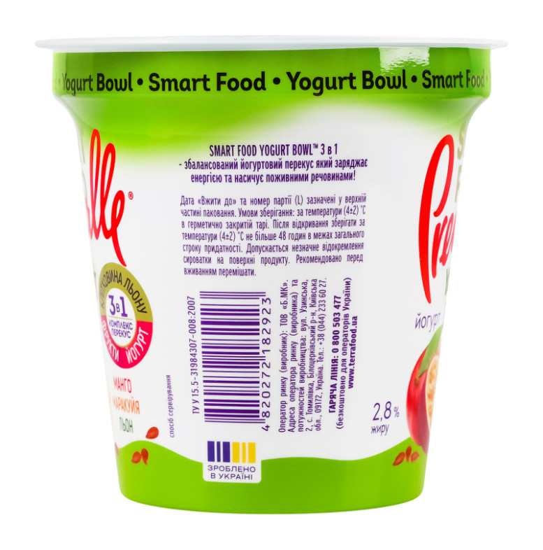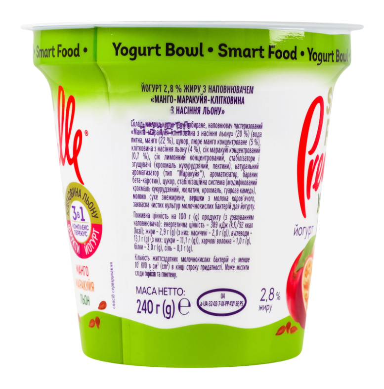 Склад (укр.) | Молоко коров'яче незбиране, наповнювач пастеризований "Манго-маракуя-клітковина з насіння льону" (20%), (вода питна, манго (22%), цукор, пюре манго концентроване (5%), клітковина з насіння льону (4%), сік маракуї концентрований (0.7%), сік лимонний концентрований, стабілізатори та згущувачі (крохмаль кукурудзяний, пектини), натуральний ароматизатор (тип "Маракуя"), ароматизатор, барвник бета-каротин), цукор, стабілізаційна система (модифікований крохмаль кукурудзяний, желатин, крохмаль, гуарова камедь), молоко сухе знежирене, вершки з молока коров'ячого, закваска чистих культур молочнокислих бактерій для йогурту |