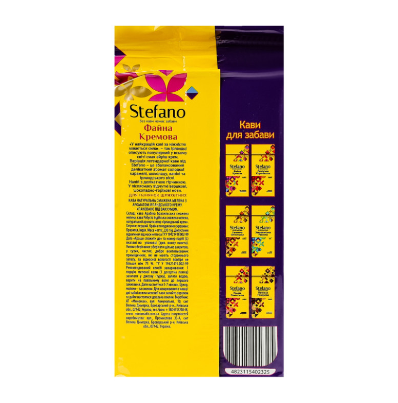 Кава натуральна смажена мелена з ароматом ірландського крему Файна Кремова Stefano 1ґ в/у 230г