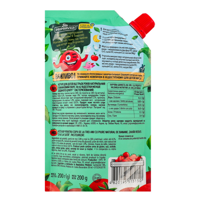 | Склад (укр.) | Вода питна, томатна паста (185г томатів на 100г кетчупу), цукор білий 8.3%, бананове пюре 8%, патока кукурудзяна (сироп глюкозний), яблучне пюре, оцет натуральний яблучний 3.1%, крохмаль кукурудзяний, сіль морська 1.4%, кумин, лавровий лист, натуральний підсолоджувач екстракт стевії 0.01% |