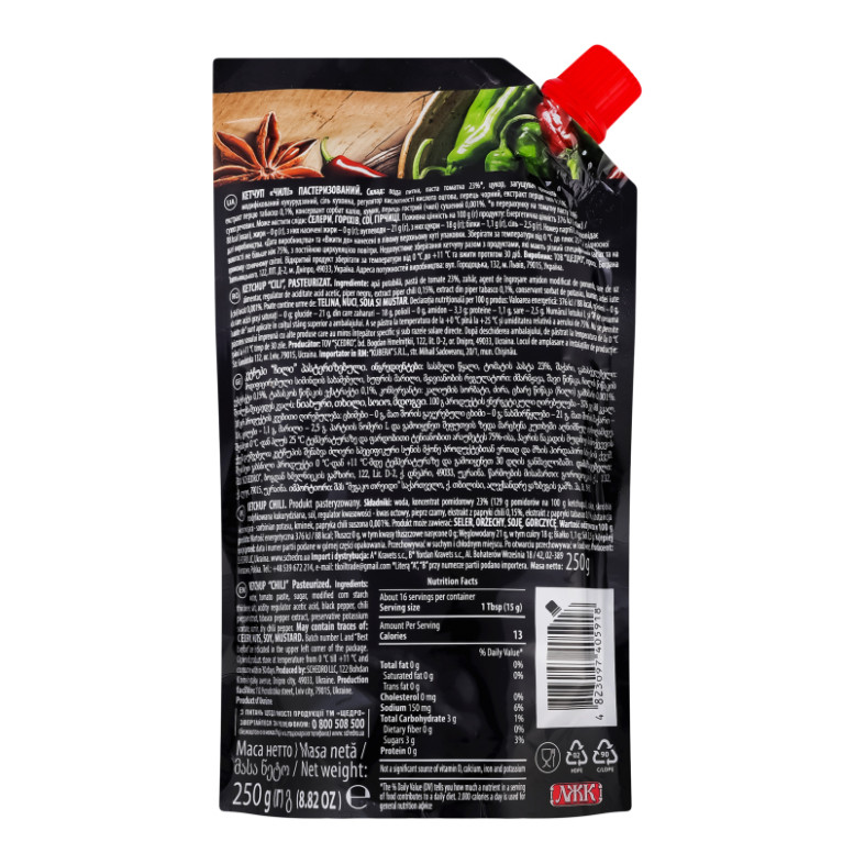 Склад: Вода питна, паста томатна 23%, цукор, загущувач крохмаль модифікований кукурудзяний, сіль кухонна, регулятор кислотності кислота оцтова, перець чорний, екстракт перцю чилі 0.15%, екстракт перцю табаско 0.1%, консервант сорбат калію, кумин, перець гострий (чилі) сушений 0.001%