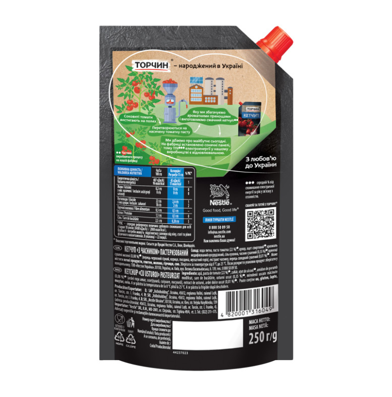 | Склад (укр.) | Вода питна, паста томатна (22%), цукор, оцет спиртовий, крохмаль модифікований кукурудзяний, сіль кухонна, часник сушений (0.35%), прянощі сушені мелені (0.08%) (перець червоний гіркий, кориця, гвоздика, мускатний горіх), екстракт часнику, перець солодкий сушений (0.01%) |