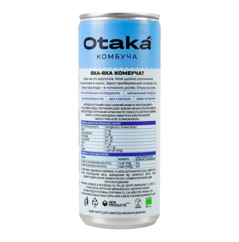 Склад (укр.) | Комбуча (вода, тростинний цукор, зелений чай 0.4%, культури комбучі), діоксид вуглецю, натуральний ароматизатор кокоса 0.1%, екстракти (моркви, яблука та чорної смородини), симбіотична культура бактерій чайного гриба Scoby |
