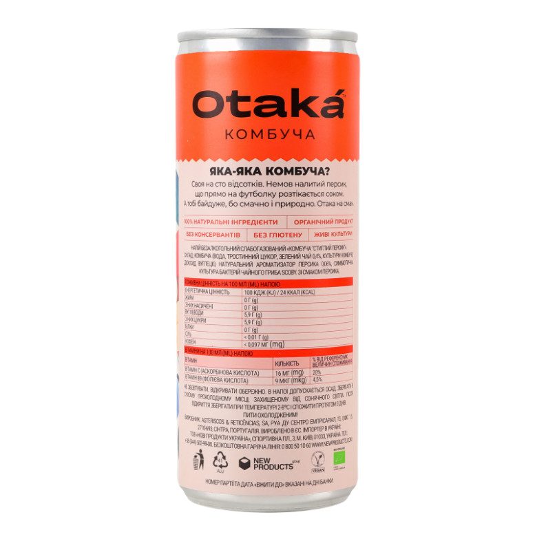 Склад (укр.) | Комбуча (вода, тростинний цукор, зелений чай 0.4%, культури комбучі), діоксид вуглецю, натуральний ароматизатор персика 0.06%, симбіотична культура бактерій чайного гриба Scoby |