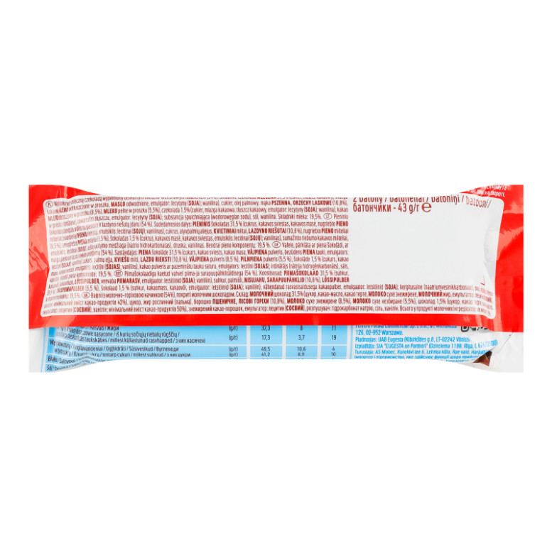 | Склад (укр.) | Молочний шоколад 31.5% (цукор, какао-масло, какао терте, молоко сухе знежирене, молочний жир, емульгатор: лецитин (соєвий), ванілін, мінімальний вміст какао-продуктів 42%), цукор, жир рослинний (пальма), борошно пшеничне, лісові горіхи (10.8%), молоко сухе знежирене (8.5%), молоко сухе незбиране (5.5%), шоколад 1.5% (цукор, какао терте, какао-масло, емульгатор: лецитин (соєвий), ванілін, мінімальний вміст какао-продуктів 50%), знежирений какао-порошок, емульгатор лецитин (соєвий), розпушувач: гідрокарбонат натрію, сіль, ванілін |