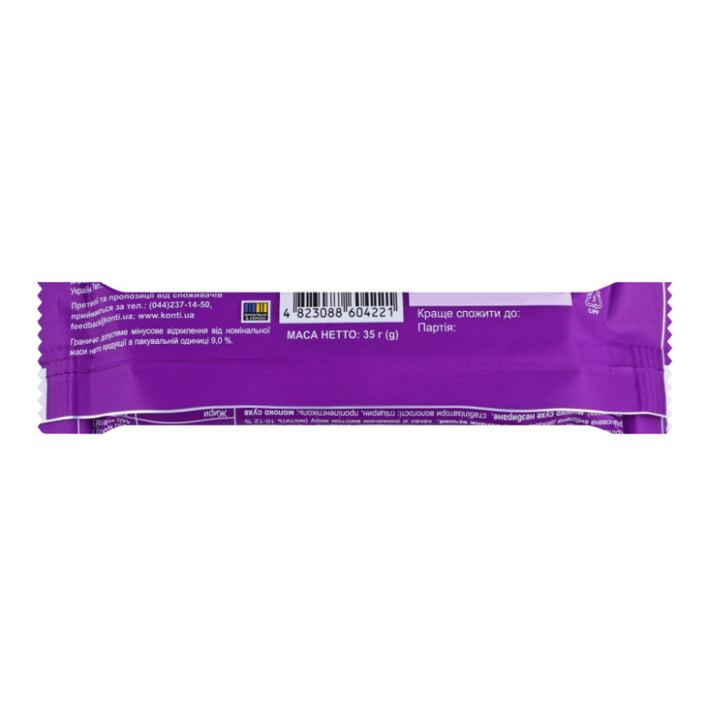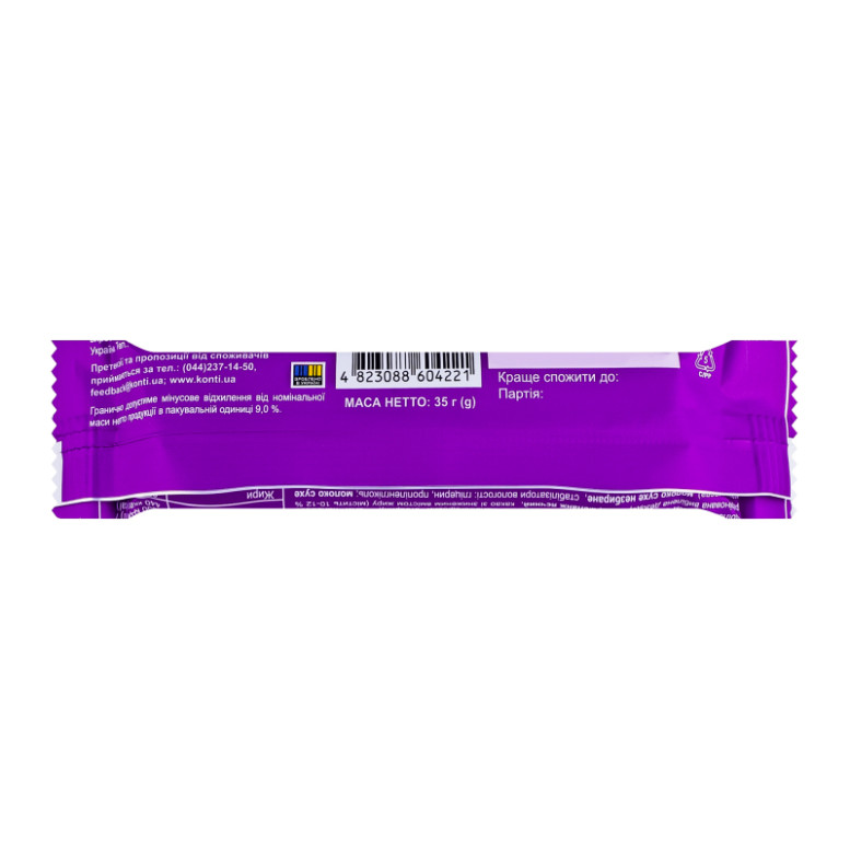| Склад (укр.) | Цукор, патока крохмальна кукурудзяна, борошно пшеничне в/с, замінник какао-масла лауриновий (рафінований вибілений дезодорований повністю гідрогенізований пальмоядровий стеарин), олія пальмова рафінована вибілена дезодорована, меланж яєчний, какао зі зниженим вмістом жиру (містить 10-12% какао-масла), молоко сухе незбиране, стабілізатори вологості: гліцерин, пропіленгліколь, молоко сухе знежирене, сироватка молочна суха, емульгатори: паста "Естер М03" (Е471, Е1520, Е475), лецитин соєвий, моностеарат гліцерину, сіль, розпушувачі: Е450і, гідрокарбонат натрію, ароматизатори, консервант сорбат калію, регулятор кислотності: кислота лимонна, ферментний препарат "Протолад" |