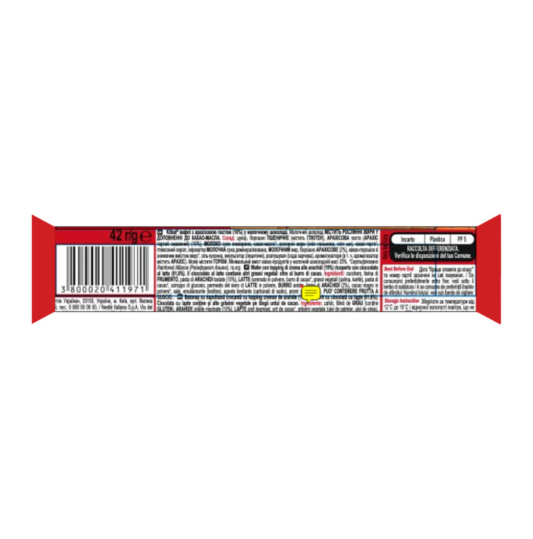 | Склад (укр.) | Цукор, борошно пшеничне (містить глютен), арахісова паста (арахіс тертий смажений) (10%), молоко сухе знежирене, какао-масло, рослинні жири (олія пальмова, олія ши), какао терте, глюкозний сироп, сироватка молочна суха демінералізована, молочний жир, борошно арахісове (2%), какао-порошок зі зниженим вмістом жиру, сіль кухонна, емульгатор (лецитини), розпушувач (сода харчова), ароматизатори (в т. ч. ароматизатор містить арахіс) |