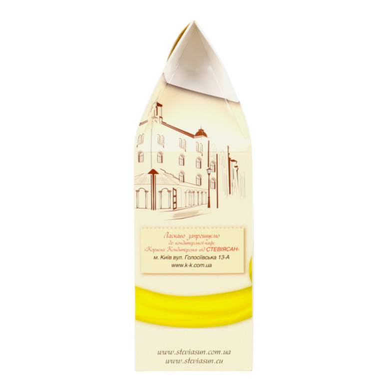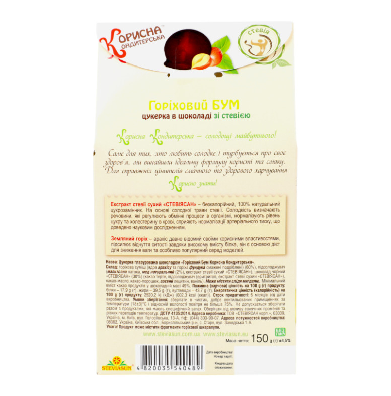 | Склад (укр.) | Горіхова суміш (ядра арахісу та горіха фундука смажені подріблені) (60%), підсолоджувач (мальтозна патока, мед натуральний (2%), екстракт стевії сухий "Стевіясан"), шоколад чорний "Стевіясан" (30%) (какао терте, підсолоджувач (еритритол, екстракт стевії сухий "Стевіясан"), какао-масло, какао-порошок, соєвий лецитин, ваніль) |