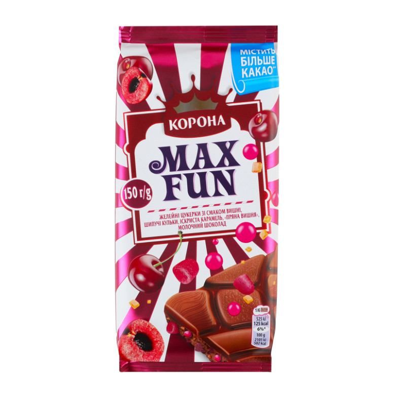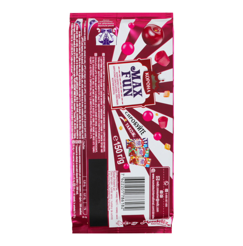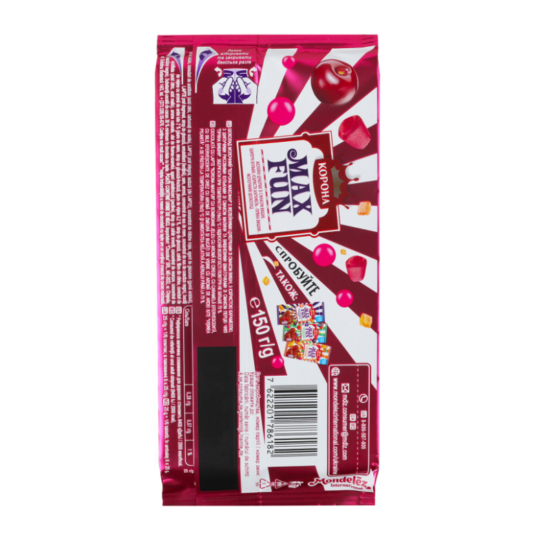 Склад: Шоколад молочний (цукор, какао терте, какао-масло, сироватка суха молочна, молоко сухе незбиране, жир молочний, молоко сухе знежирене, емульгатори (лецитин соєвий, Е476), ароматизатор), желейні цукерки зі смаком вишні 7.5% (сироп глюкозний, цукор, желатин яловичий, регулятор кислотності (кислота лимонна), агент желюючий (агар), ароматизатор натуральний, сироп цукровий карамелізований, глазуруючий агент (віск карнаубський), концентрат моркви чорної), іскриста карамель 3.5% (цукор, сироп глюкозний, двоокис вуглецю, лактоза (з молока)), шипучі рисові кульки зі смаком малини 2.5% (цукор, борошно рисове, какао-масло, регулятор кислотності (кислота лимонна, карбонати натрію), молоко сухе незбиране, лактоза (з молока), концентрат яблучного соку, концентрат соку чорної смородини), вишневі шматочки зі смаком перцю чилі 2% (пюре яблучне, сироп глюкозно-фруктозний, пюре з вишні 0.2%, сироп глюкозний, цукор, волокна цитрусові харчові, регулятори кислотності (кислота лимонна, кислота яблучна), ароматизатори натуральні, олія соняшникова, агент желюючий (пектини), сироп цукровий інвертний, концентрат моркви, концентрат чорної смородини)