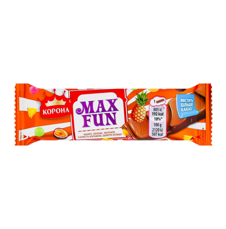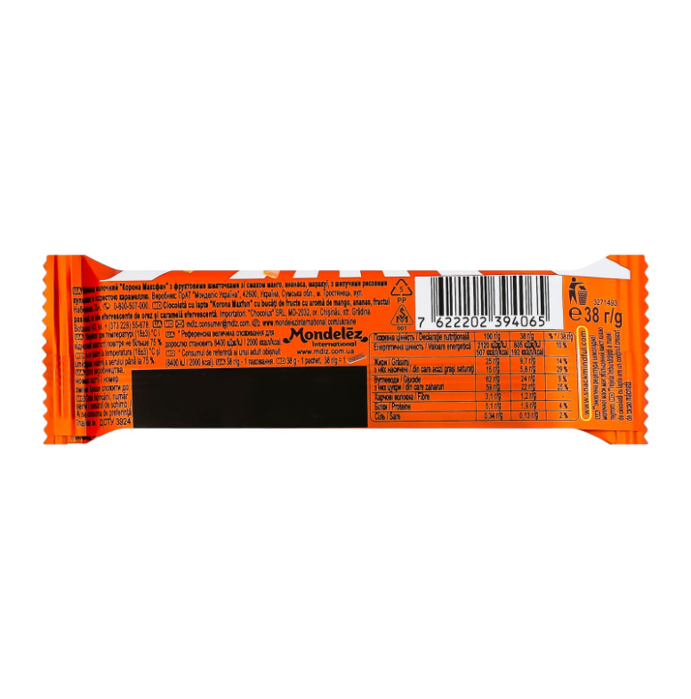 Склад: Шоколад молочний (цукор, какао терте, какао-масло, сироватка суха молочна, молоко сухе незбиране, жир молочний, молоко сухе знежирене, емульгатори (лецитин соєвий, Е476), ароматизатор), фруктові шматочки зі смаком манго, ананаса, маракуї 6.5% (пюре яблучне концентроване, сироп глюкозно-фруктозний, сироп глюкозний, цукор, концентрати соків (сік ананасовий 0.2%, сік маракуї 0.2%), пюре манго концентроване 0.2%, волокна пшениці харчові, олія пальмова, ароматизатори, агент желюючий (пектин), регулятор кислотності (кислота лимонна)), іскриста карамель 4% (цукор, сироп глюкозний, двоокис вуглецю, лактоза (з молока)), шипучі рисові кульки зі смаком малини, полуниці, лимона, лайма, апельсина 4% (цукор, борошно рисове 0.8%, какао-масло, регулятори кислотності (кислота лимонна, карбонати натрію), молоко сухе незбиране, лактоза (з молока), крохмаль з тапіоки, молоко сухе знежирене, глазуруючий агент (шеллак), емульгатор (лецитини), сироп глюкозний, ароматизатор, сіль, барвники (рибофлавін, екстракт паприки, Е141), концентрати соків (редису червоного, яблука, чорної смородини))