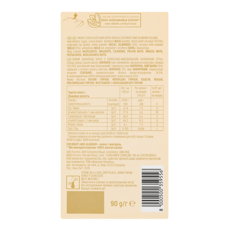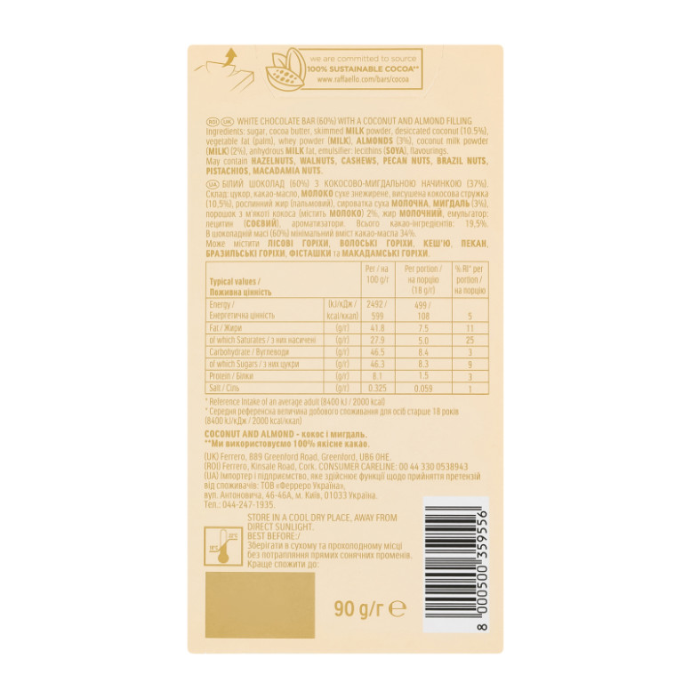 | Склад (укр.) | Цукор, какао-масло, молоко сухе знежирене, висушена кокосова стружка (10.5%), рослинний жир (пальмовий), сироватка суха молочна, мигдаль (3%), порошок з м'якоті кокоса (містить молоко) 2%, жир молочний, емульгатор: лецитин (соєвий), ароматизатори |